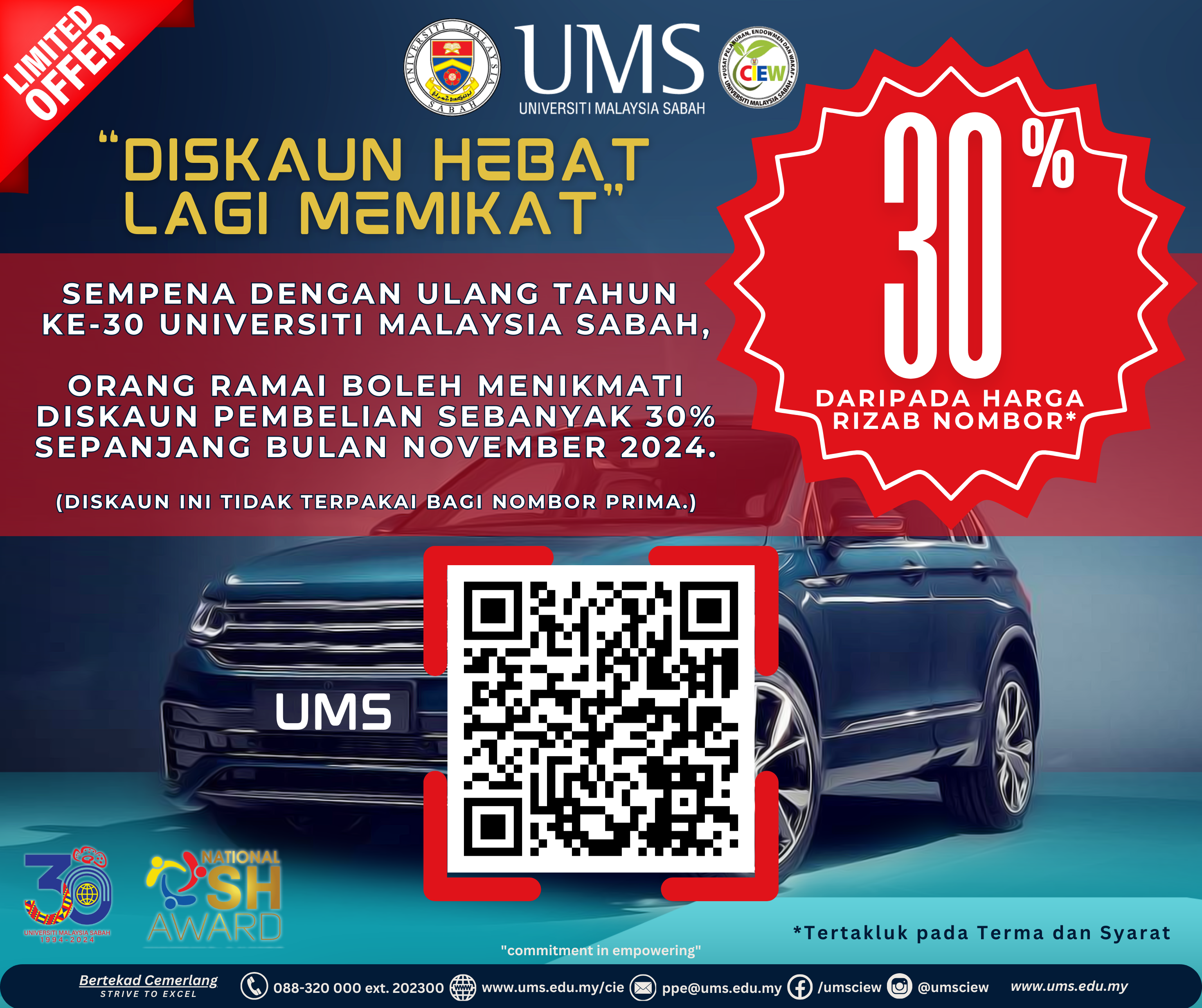 Pusat Pelaburan, Endowmen dan Wakaf (CIEW) mempelawa orang ramai untuk membeli Nombor Plat UMS dan berpeluang menikmati diskaun sebanyak 30% Sempena Ulang Tahun Ke-30 Universiti Malaysia Sabah.