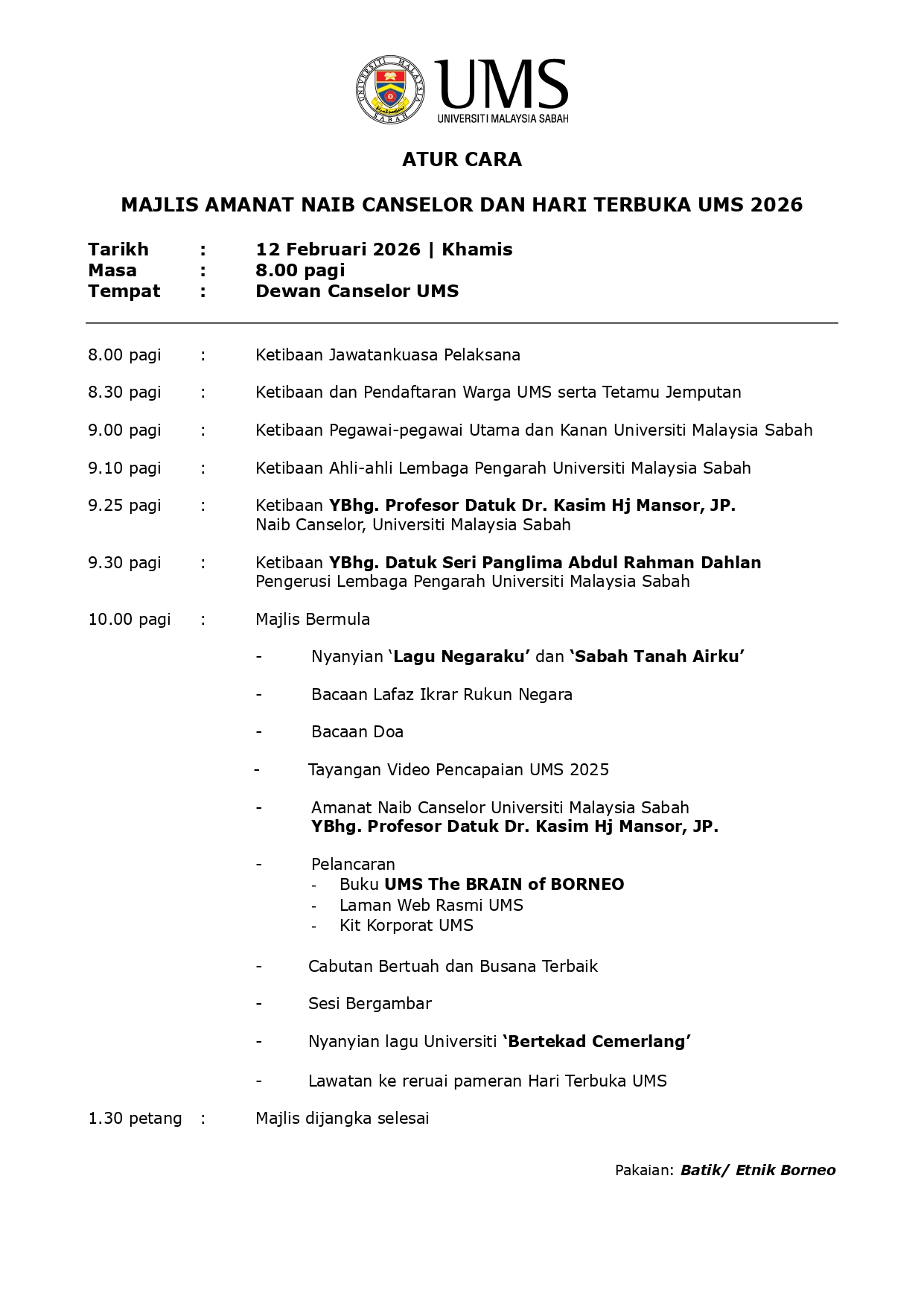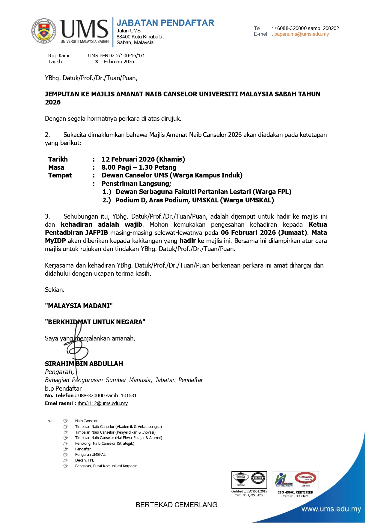 04 Februari 2026 Jumlah paparan: 1023 Jemputan Ke Majlis Amanat Naib Canselor UMS Tahun 2026 Cetak Emel Pengumuman Daripada: Bahagian Pengurusan Sumber Manusia