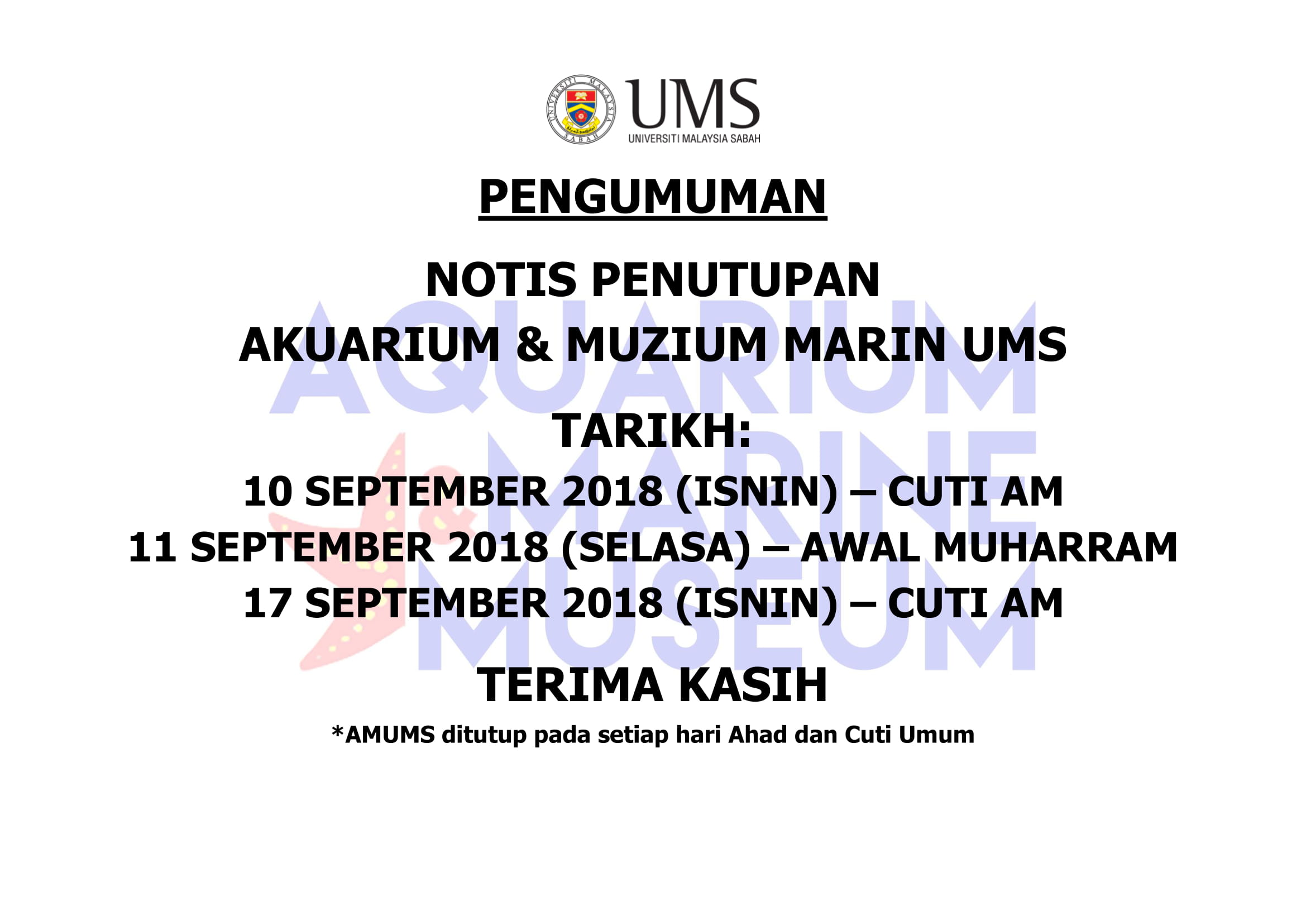 05 September 2018 Jumlah paparan: 5105 NOTIS PENUTUPAN AKUARIUM & MUZIUM MARIN UMS Cetak Emel Pengumuman Daripada: Akuarium & Muzium Marin UMSSubjek: Notis Penutupan Akuarium & Muzium Marin UMS