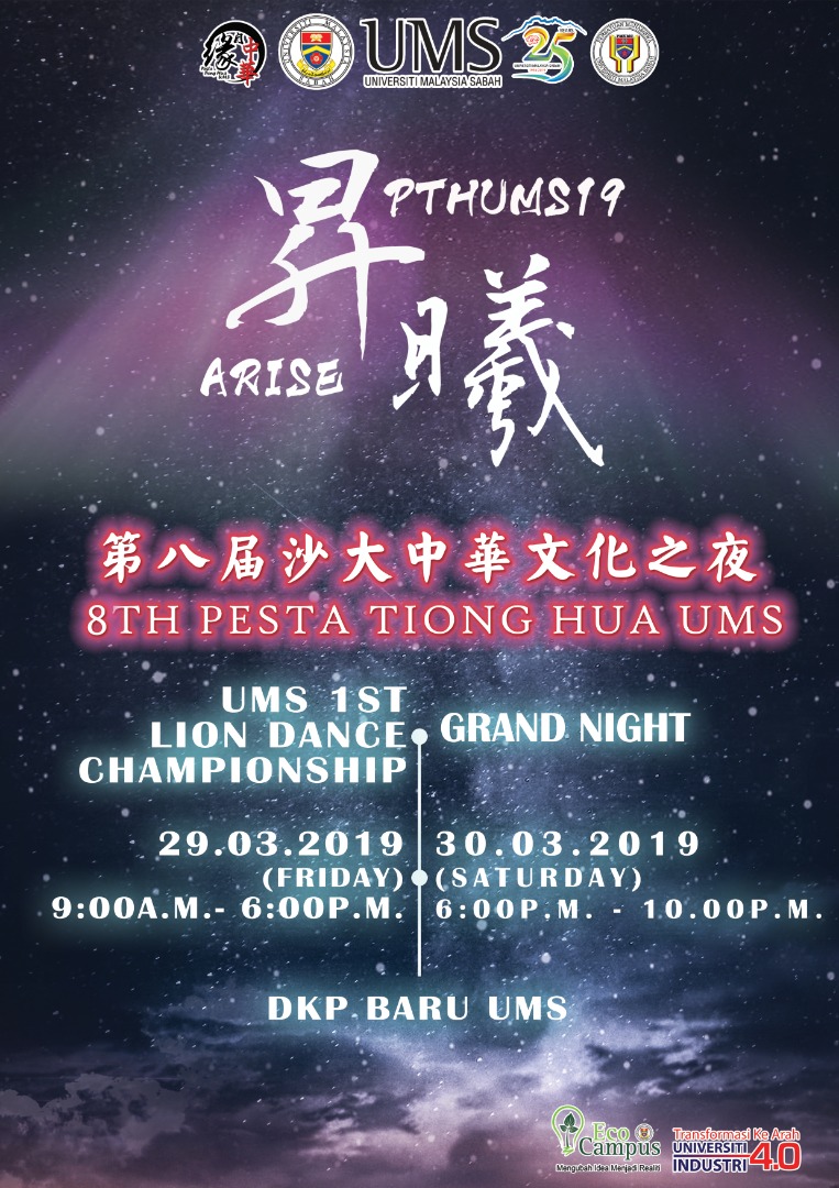 20 Mac 2019 Jumlah paparan: 4579 University Malaysia Sabah 1st Lion Dance Championship & Pesta Tiong Hua Grand Night Cetak Emel PENGUMUMAN DARIPADA : MAJLIS PERWAKILAN PELAJAR UMSSUBJEK : UMS 1ST LION DANCE CHAMPIONSHIP & PESTA TIONG HUA GRAND NIGHT