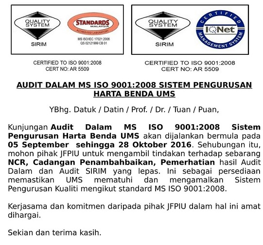 Kunjungan Audit Dalam MS ISO 9001:2008 Sistem Pengurusan Harta Benda UMS akan dijalankan bermula pada 05 September sehingga 28 Oktober 2016. Sehubungan itu, mohon pihak JFPIU untuk mengambil tindakan terhadap sebarang NCR, Cadangan Penambahbaikan, Pemerhatian hasil Audit Dalam dan Audit SIRIM yang lepas. Ini sebagai persediaan memastikan UMS mematuhi dan mengamalkan Sistem Pengurusan Kualiti mengikut standard MS ISO 9001:2008.