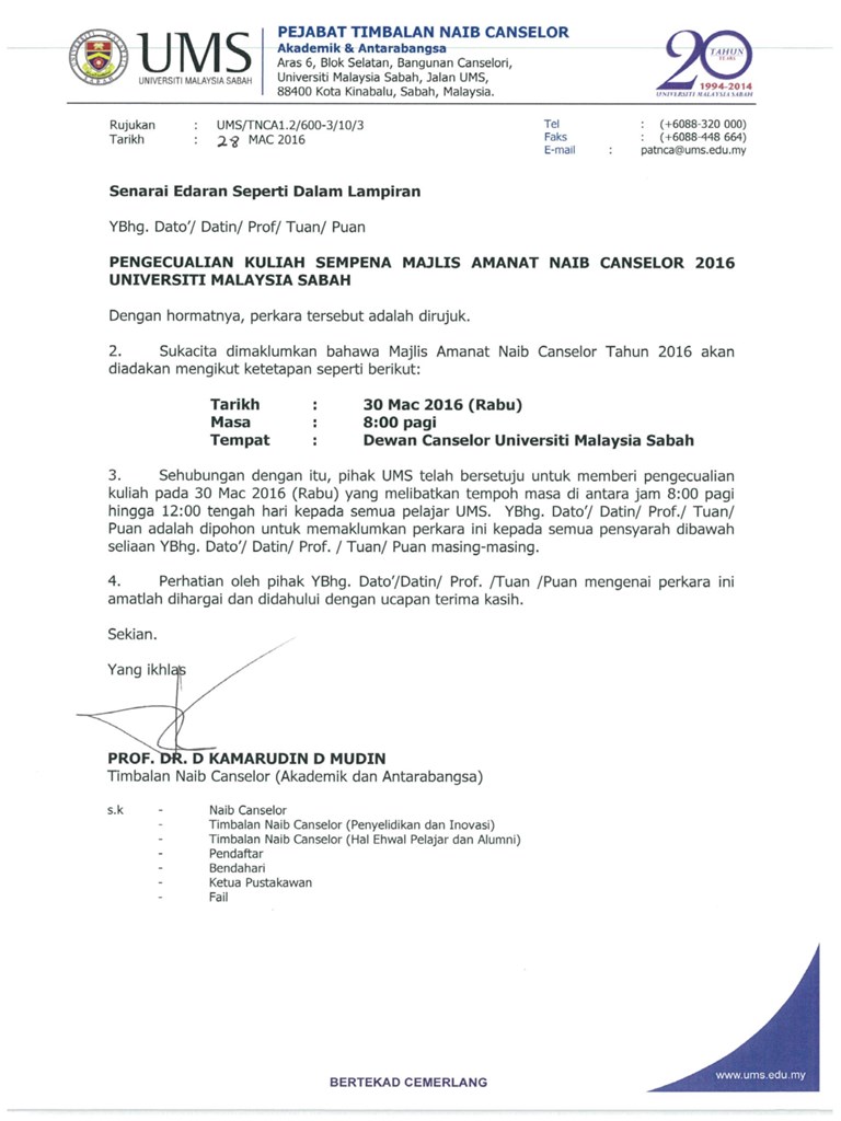 3. Mohon perkara ini dimaklumkan kepada semua kakitangan di J/F/P/I/U/B masing-masing. Pekeliling tersebut boleh dicapai melalui laman web Jabatan Pendaftar (http://www.ums.edu.my/ pendaftar/).