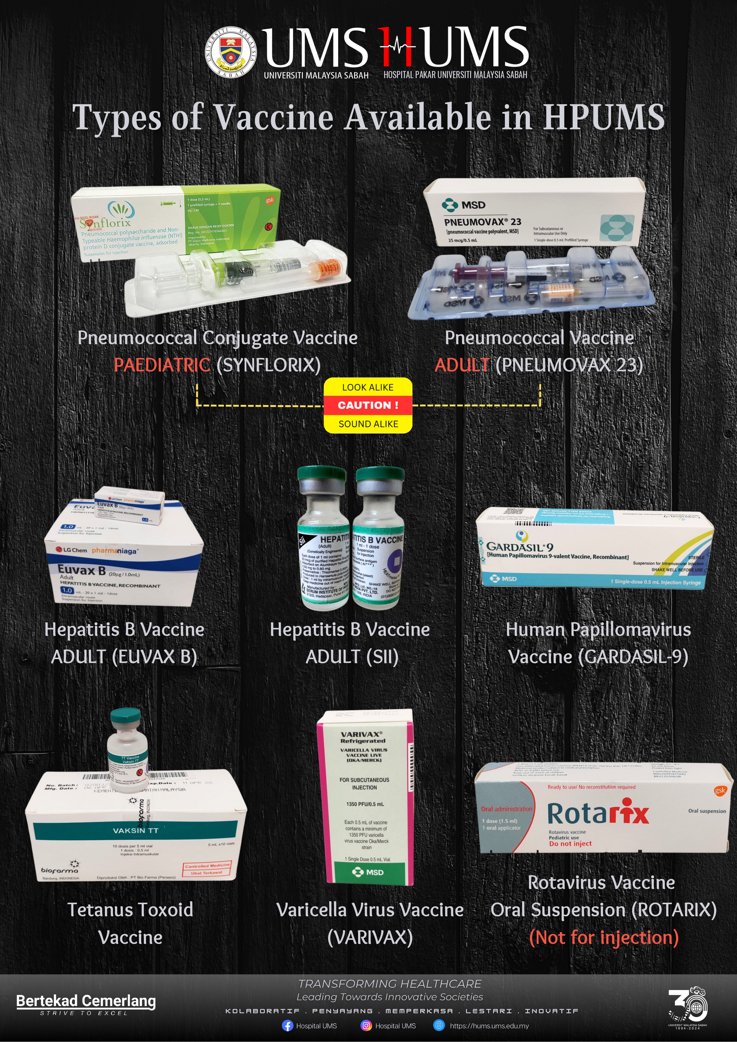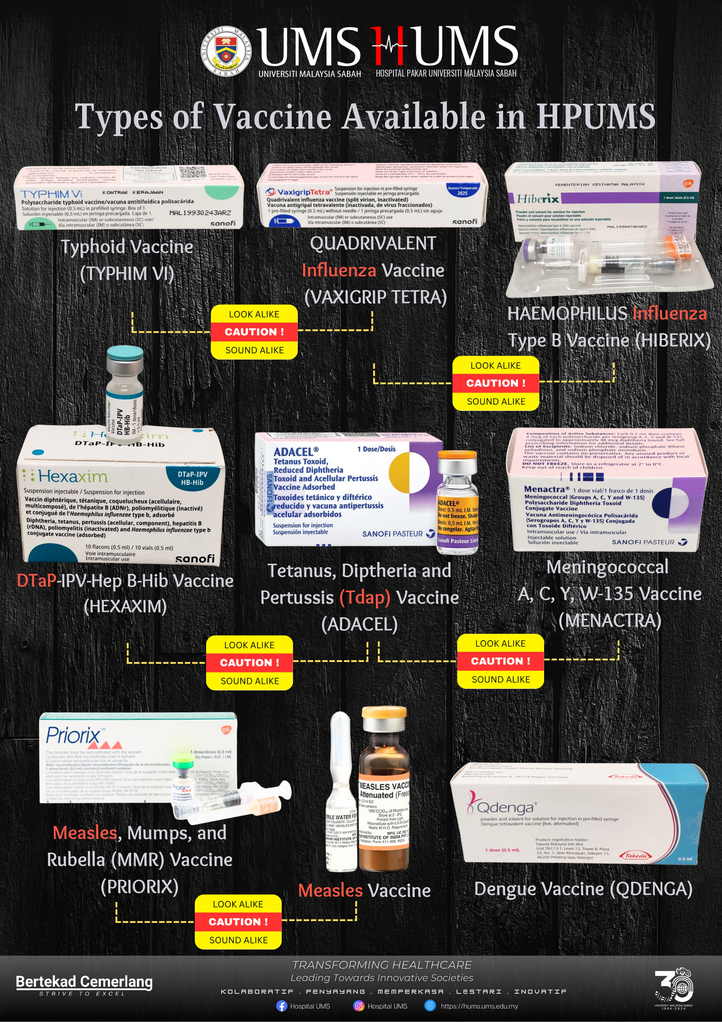 Sejajar dengan itu, Jabatan Farmasi HPUMS ingin berkongsi sebuah infografik ringkas yang memaparkan rupa dan jenis vaksin yang terdapat di HPUMS sebagai panduan. Terdapat beberapa vaksin yang mempunyai penampilan yang serupa (Look-Alike) atau nama yang hampir sama (Sound-Alike). Vaksin-vaksin ini dikenali sebagai Look-Alike Sound-Alike (LASA) medication. Justeru, diharapkan semua staf sentiasa berhati-hati dalam mengendalikan vaksin khususnya vaksin yang dikategorikan sebagai LASA. Label pada kotak vaksin hendaklah dibaca dengan teliti bagi memastikan vaksin yang dikendalikan adalah vaksin yang tepat.