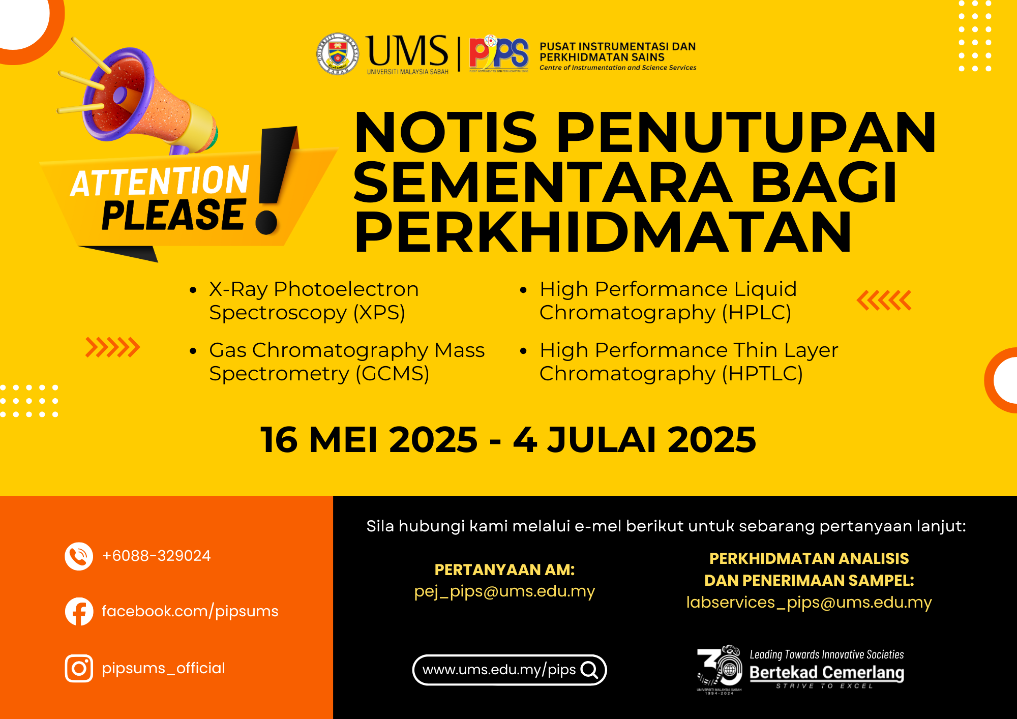 Dimaklumkan bahawa poster hebahan berkaitan notis penutupan sementara perkhidmatan instrumen XPS, GCMS, HPLC, dan HPTLC di Pusat Instrumentasi dan Perkhidmatan Sains (PIPS), Universiti Malaysia Sabah, dilampirkan bersama untuk makluman dan rujukan YBhg. Prof./Prof. Madya Dr./Dr./Tuan/Puan.