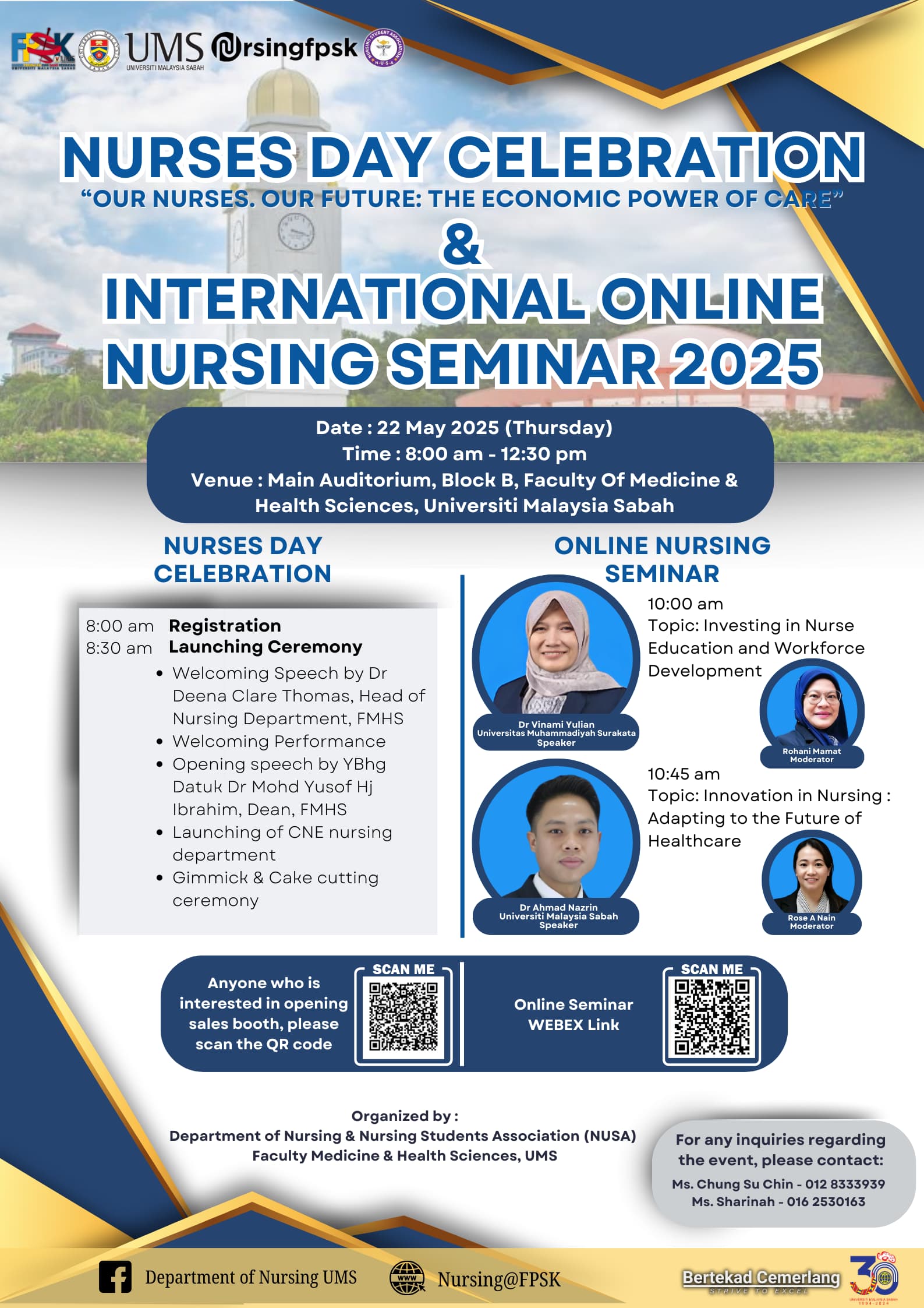 Sukacita dimaklumkan bahawa Jabatan Kejururawatan, Fakulti Perubatan dan Sains Kesihatan (FPSK), Universiti Malaysia Sabah (UMS) bersama Nursing Students Association (NUSA) akan menganjurkan program seperti ketetapan berikut: