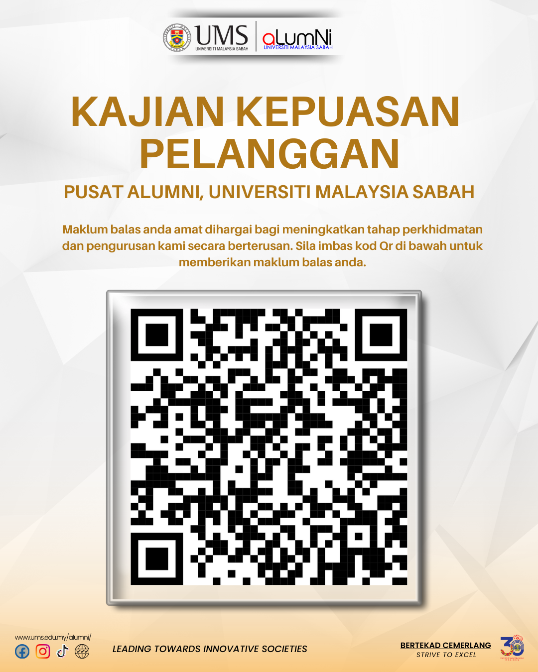 Bagi tujuan penambahbaikan berterusan, pihak YBrs. Prof. /Dr. /tuan/puan dimohon untuk mengisi maklumbalas kajian kepuasan pelanggan terhadap perkhidmatan yang diberikan oleh Pusat Alumni di pautan berikut: