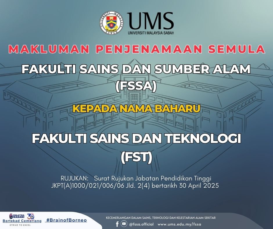 Adalah dimaklumkan bahawa merujuk kepada surat daripada Jabatan Pendidikan Tinggi 30 April 2025 dengan nombor rujukan JKPT(A)1000/021/006/06 Jld. 2(4) Fakulti Sains dan Sumber Alam (FSSA) telah dijenamakan kepada Fakulti Sains dan Teknologi (FST).