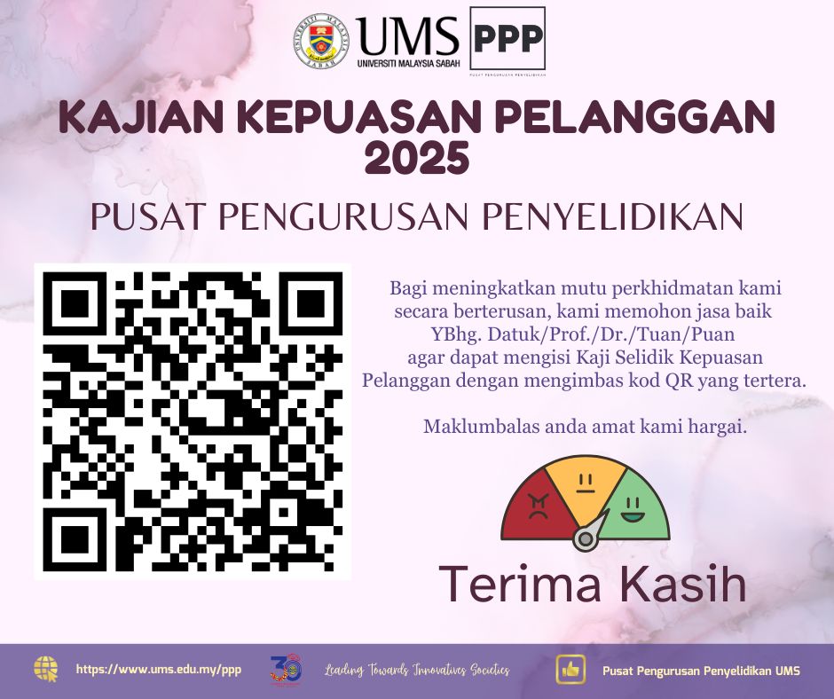 Bagi tujuan meningkatkan kualiti perkhidmatan PPP, mohon jasa baik pihak YBhg. Datuk/Datin/Prof./Dr./Tuan/Puan agar dapat mengisi Kaji Selidik Kepuasan Pelanggan PPP dengan mengimbas kod QR  yang dipaparkan atau melalui pautan berikut: https://eoffice.ums.edu.my/e-respon/kepuasan_pelanggan.php?id=207&key=PPP.