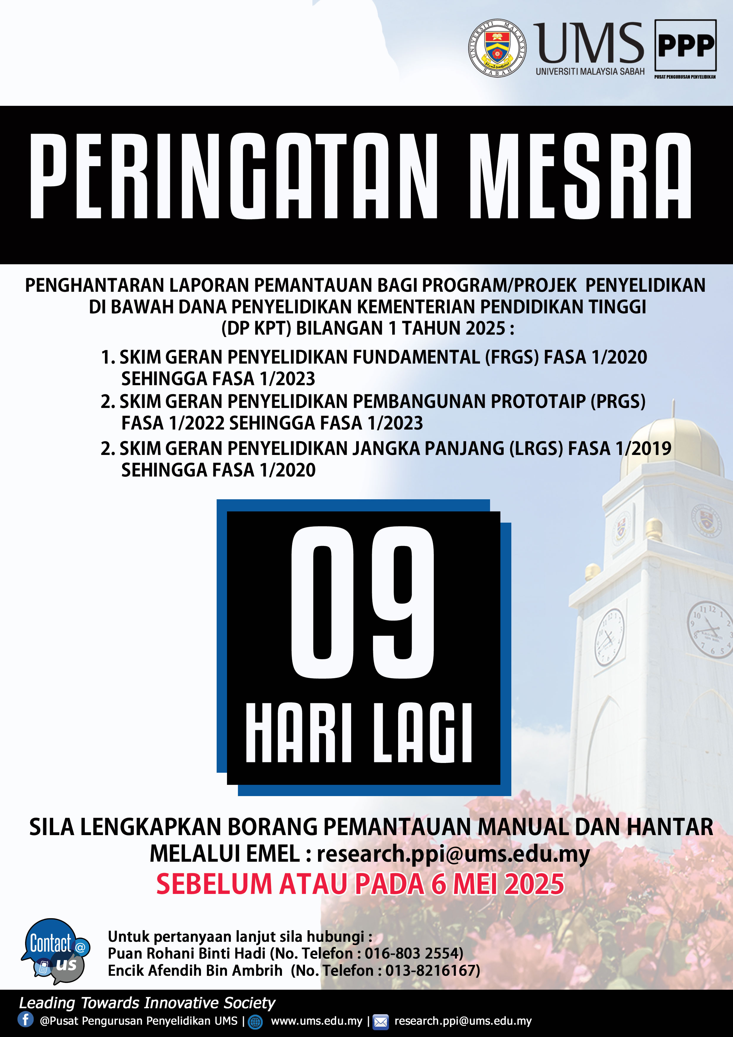 Sepertimana YBrs.Prof./Dr./Tuan/Puan sedia maklum, pemantauan Program /Projek Penyelidikan yang telah di luluskan di bawah Dana Penyelidikan Kementerian Pendidikan Tinggi (DP KPT) Bilangan 1 Tahun 2025 telah dilaksanakan bermula 21 Mac 2025 dan berakhir pada 6 Mei 2025. Ketua Program/Projek penyelidikan hendaklah mengemukakan laporan prestasi dan kewangan (data sehingga 31 Disember 2024) sebelum atau pada 6 Mei 2025. Pemantauan laporan prestasi program/projek penyelidikan ini merangkumi skim geran penyelidikan seperti berikut :