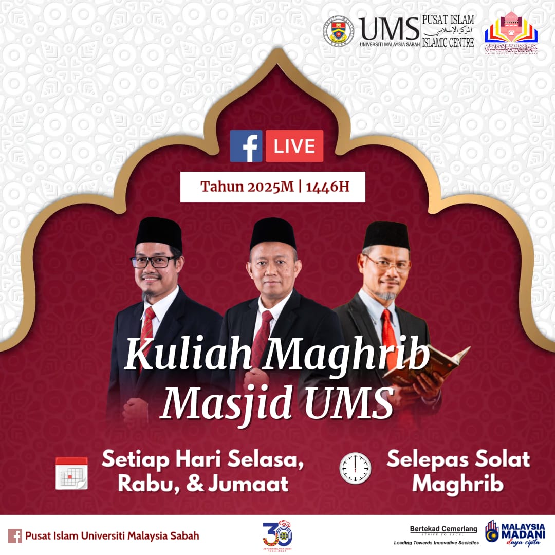 2. Sukacita dimaklumkan bahawa, Pusat Islam Universiti Malaysia Sabah (UMS) akan menyambung semula Kuliah Maghrib di Masjid UMS  yang akan diadakan pada ketetapan seperti maklumat berikut: