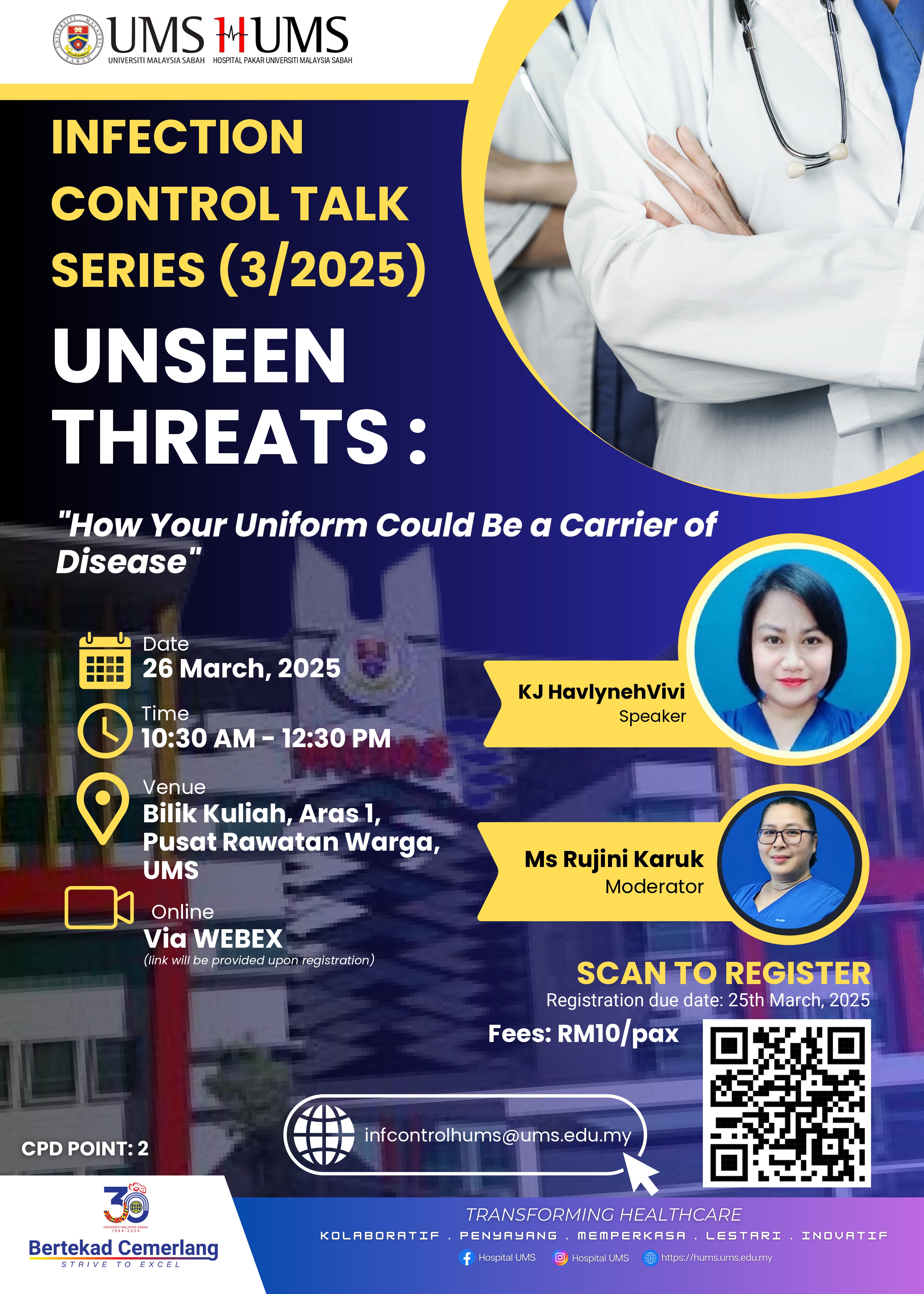 Bayaran kepada | : | AMBANK 8881042014287 Hospital Universiti Malaysia Sabah Reference 1: Infection Control Talk Series 3/2025 Reference 2: Nama Peserta |