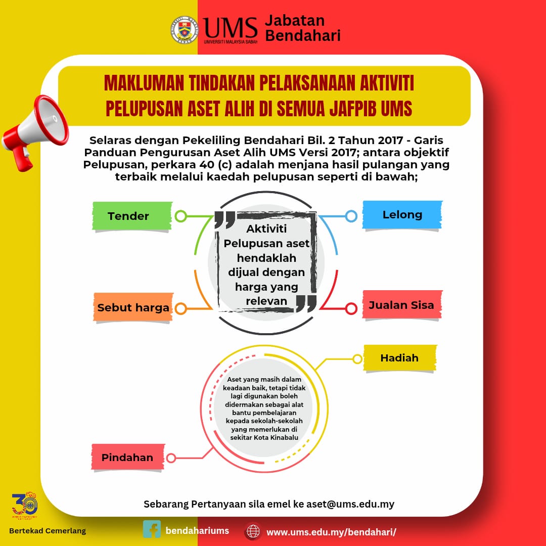 Sukacita dimaklumkan bahawa Sektor Pengurusan Harta & Risiko, Jabatan Bendahari telah menyediakan hebahan infografik sebagai pemakluman kepada seluruh JAFPIB mengenai Tindakan Pelaksanaan Aktiviti Pelupusan Aset Alih Di semua JAFPIB UMS untuk tindakan.