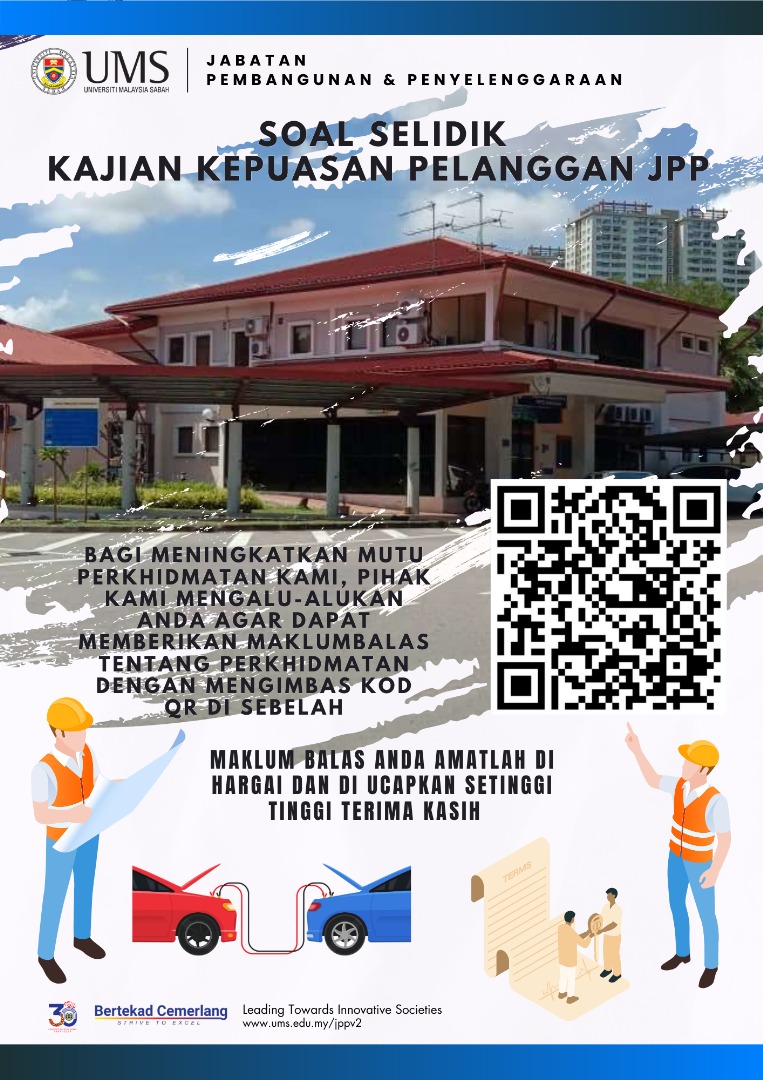 Bagi meningkatkan mutu perkhidmatan kami, pihak JPP memohon kerjasama dan jasa baik YBrs. Prof. Datuk/Prof./Dr./Tuan/Puan agar dapat mengisi soal selidik Kajian Kepuasan Pelanggan JPP seperti yang dihebahkan melalui Poster.