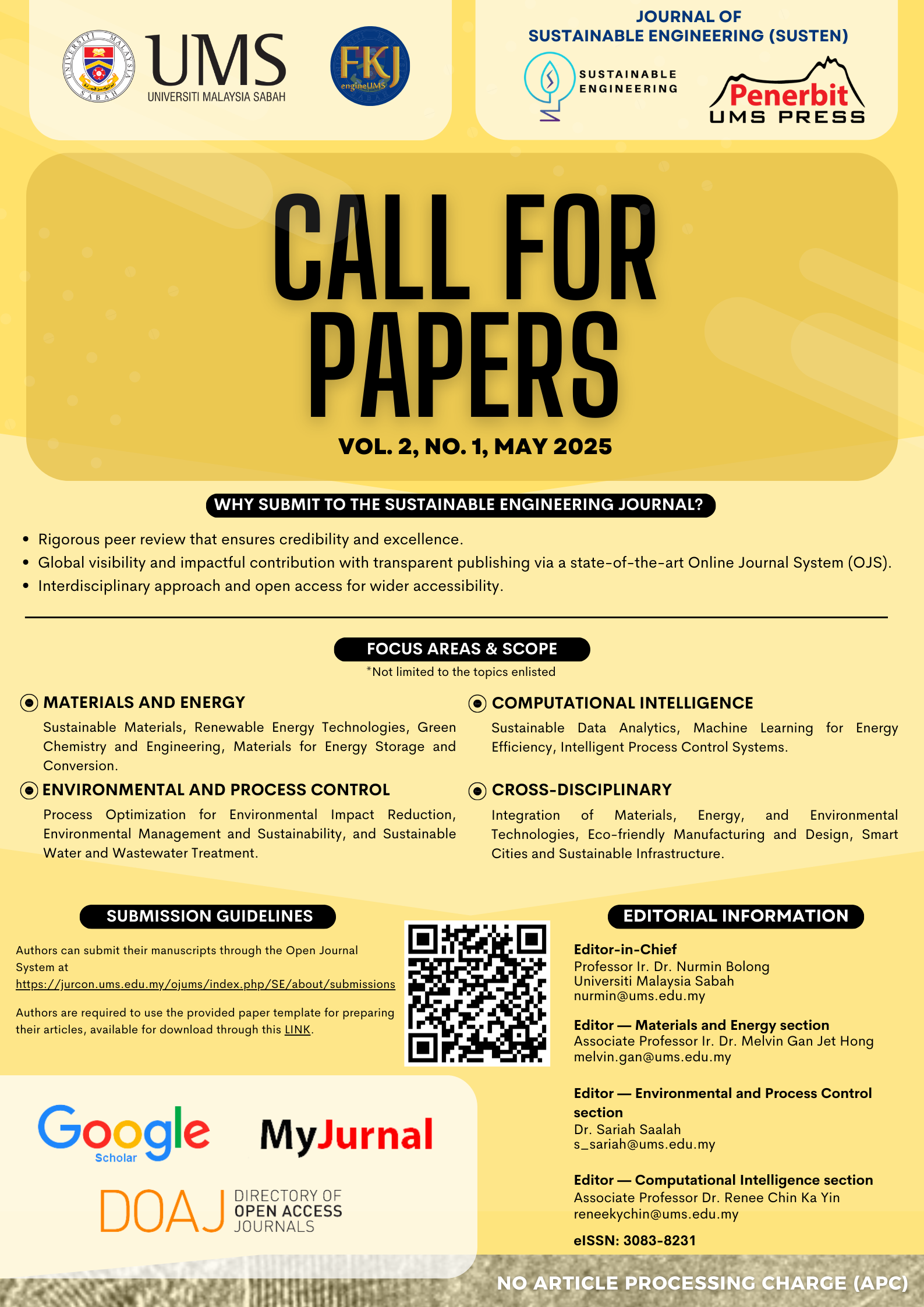 Exciting News! The Sustainable Engineering Journal (SUSTEN) is now accepting submissions for the upcoming issue. Don't miss this opportunity to contribute and submit your paper at this link, and be part of this exciting new initiative to advance sustainable engineering research and practice.