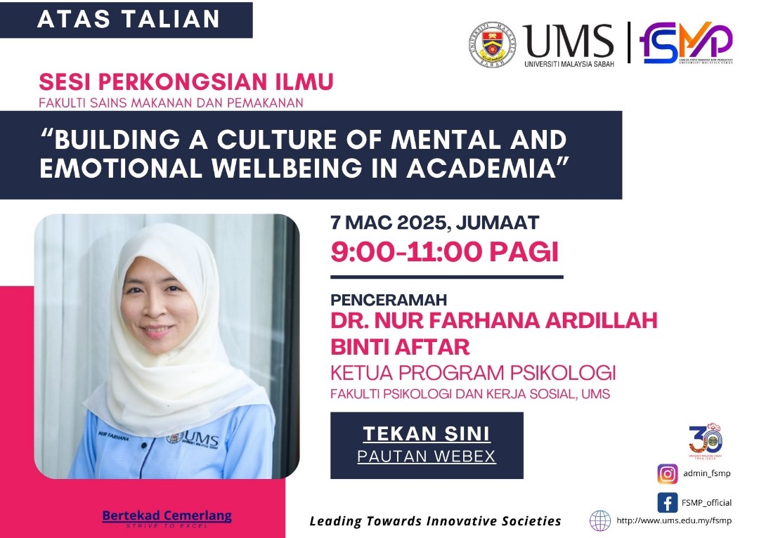 Fakulti Sains Makanan dan Pemakanan (FSMP) melalui Jawatankuasa Keselamatan dan Kesihatan Pekerjaan (JKKP) FSMP akan mengadakan sesi perkongsian ilmu bertajuk Building a Culture of Mental and Emotional Wellbeing in Academia pada ketetapan seperti berikut:
