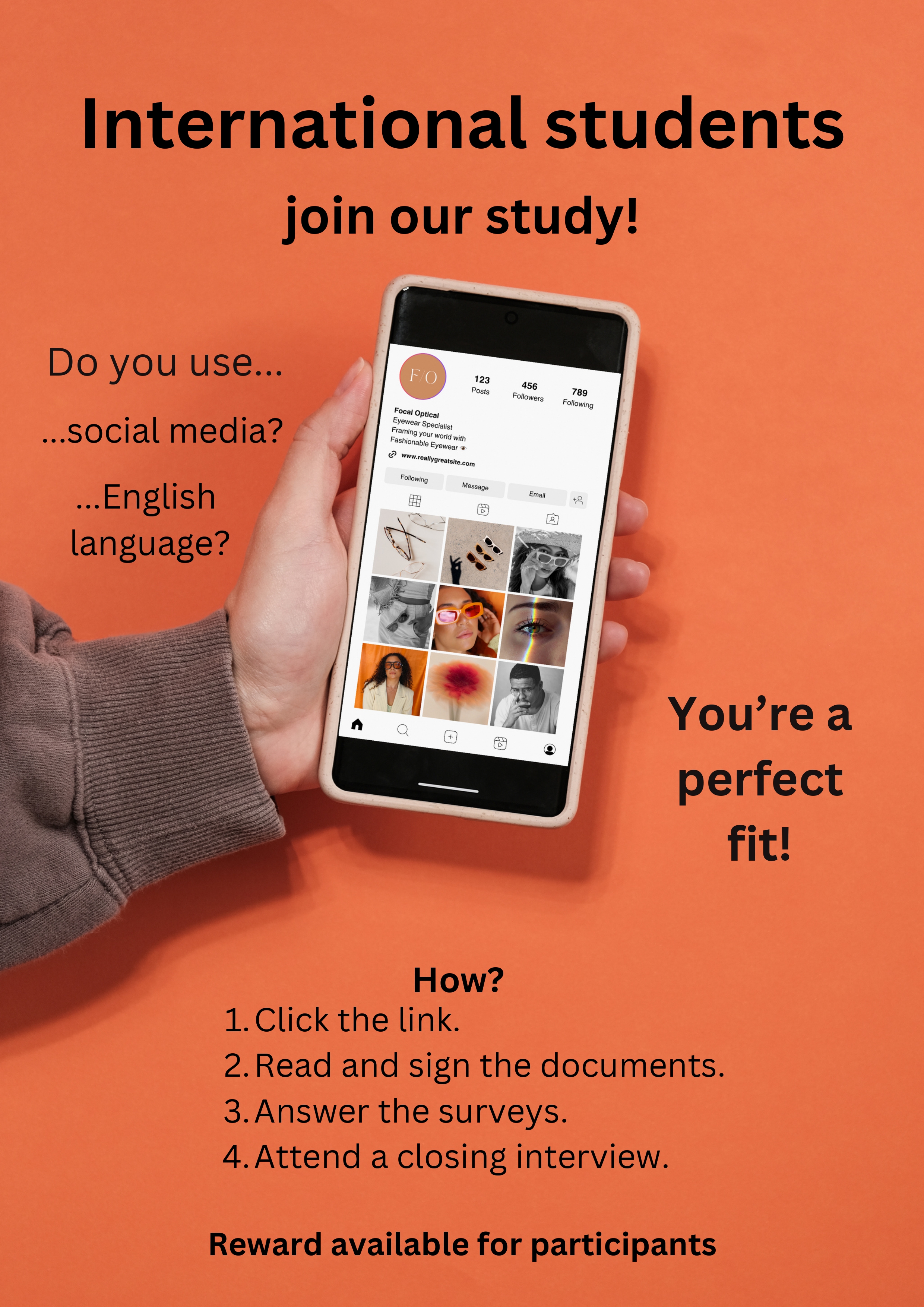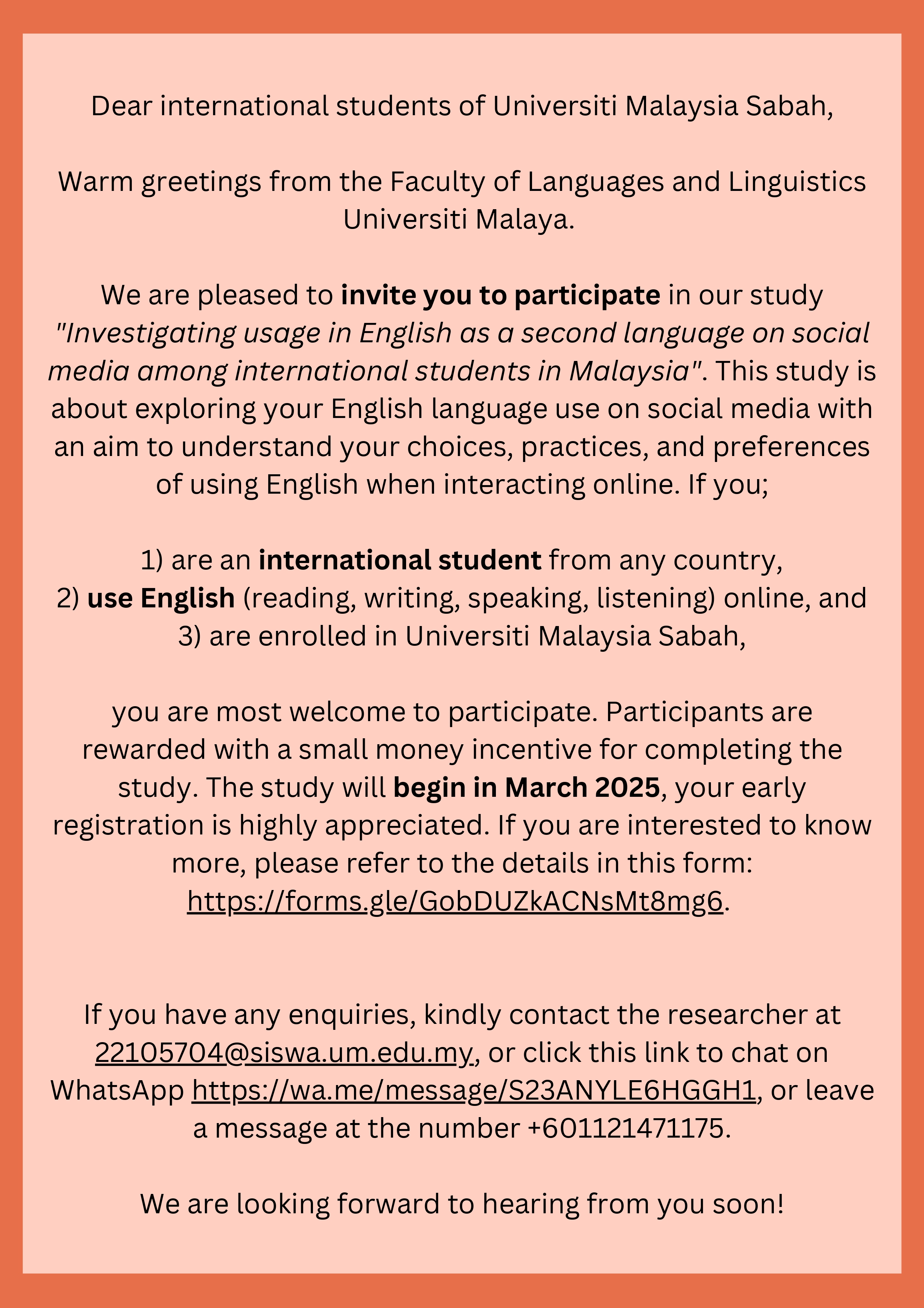 We are pleased to invite you to participate in our study "Investigating usage in English as a second language on social media among international students in Malaysia". This study is about exploring your English language use on social media with an aim to understand your choices, practices, and preferences of using English when interacting online. If you;