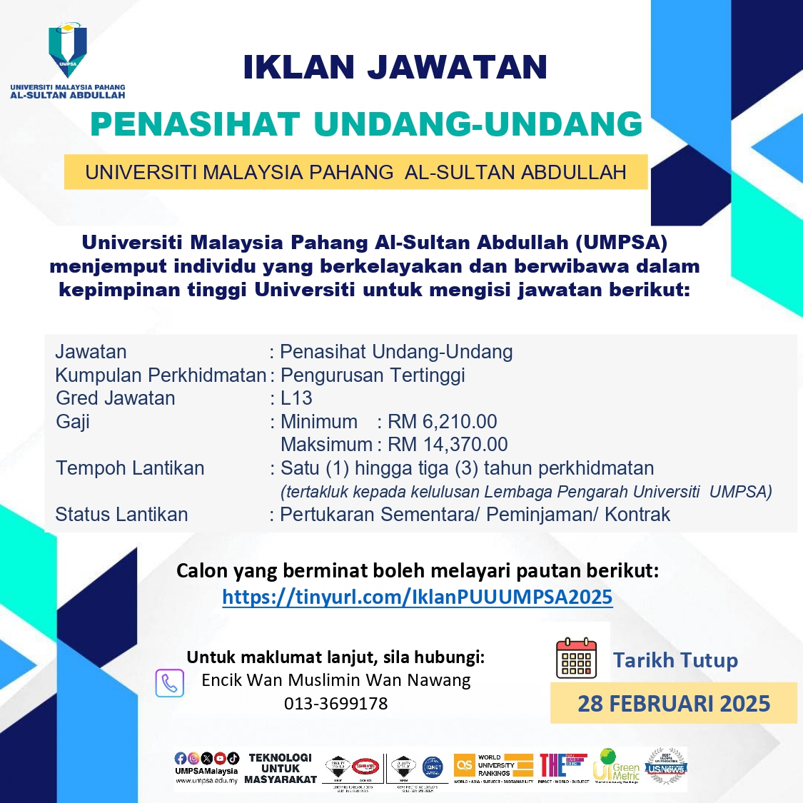Iklan Jawatan Penasihat Undang-Undang Universiti Malaysia Pahang Al-Sultan Abdullah (UMPSA)