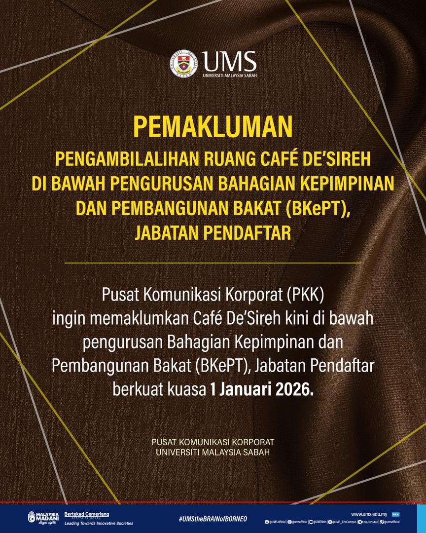 Adalah dimaklumkan bahawa, LAPORAN AKHIR HASIL PEMERIKSAAN MENGEJUT PENGURUSAN KEWANGAN PUSAT TANGGUNGJAWAB (PTJ) UMS TAHUN 2025 telah dibentangkan di dalam Mesyuarat Jawatankuasa Pengurusan Universiti Bil. 1/2026 yang diadakan pada 9 Januari 2026 (Jumaat). Pihak pengurusan merakamkan ucapan tahniah dan terima kasih atas komitmen semua PTJ di dalam pelaksanaan aktiviti berkenaan.
