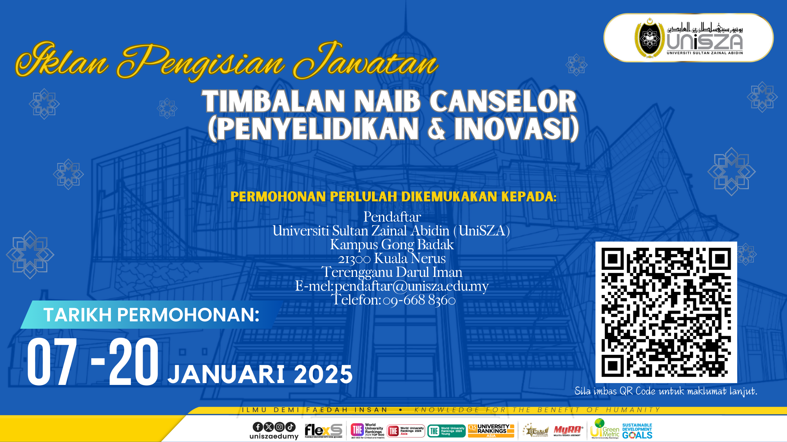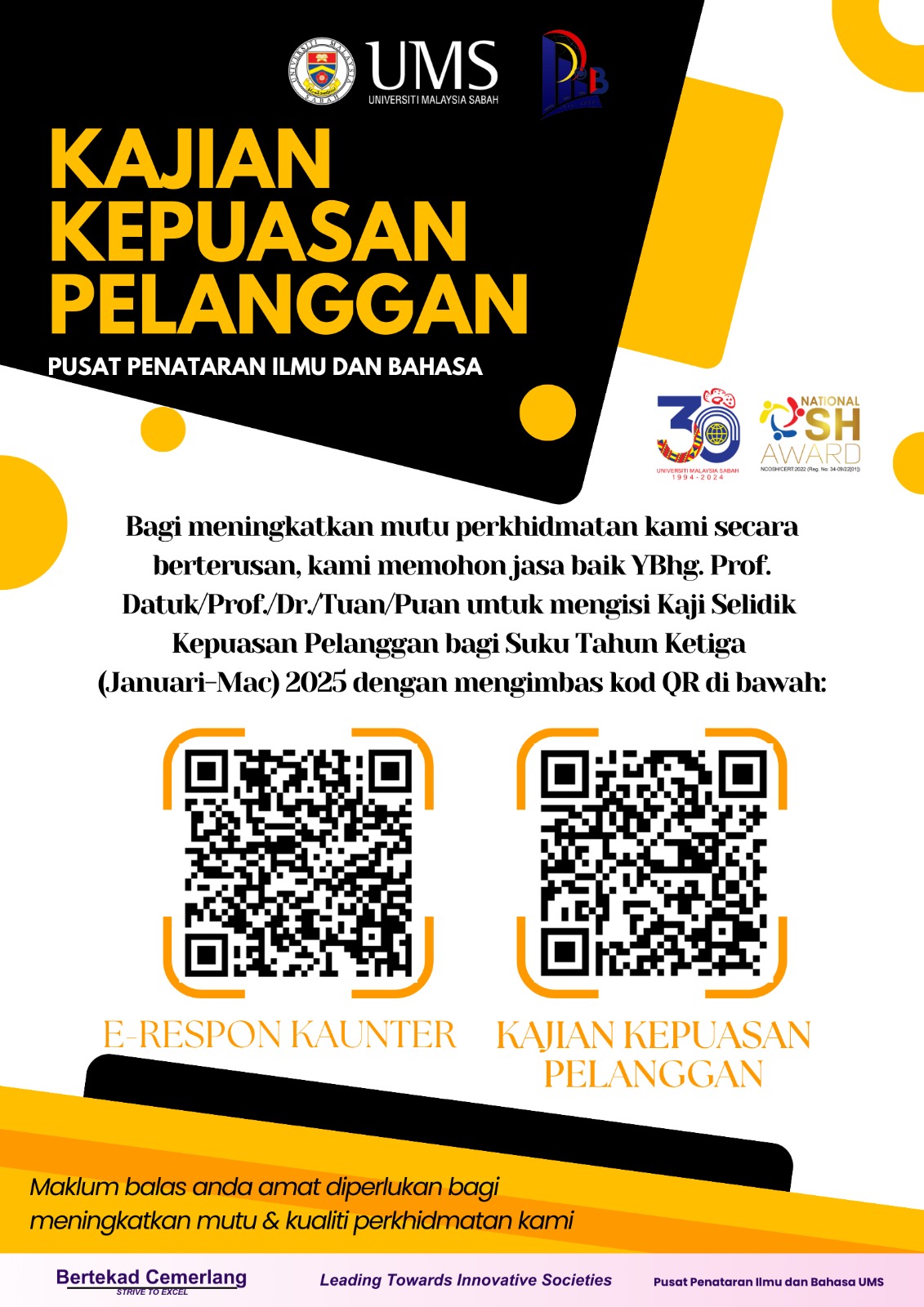 Pihak kami memohon maklum balas daripada YBrs. Prof./Prof. Madya/Dr./Tuan/Puan untuk melengkapkan soal selidik kajian kepuasan pelanggan melalui imbasan kod QR di poster bagi meningkatkan mutu & kualiti perkhidmatan kami.