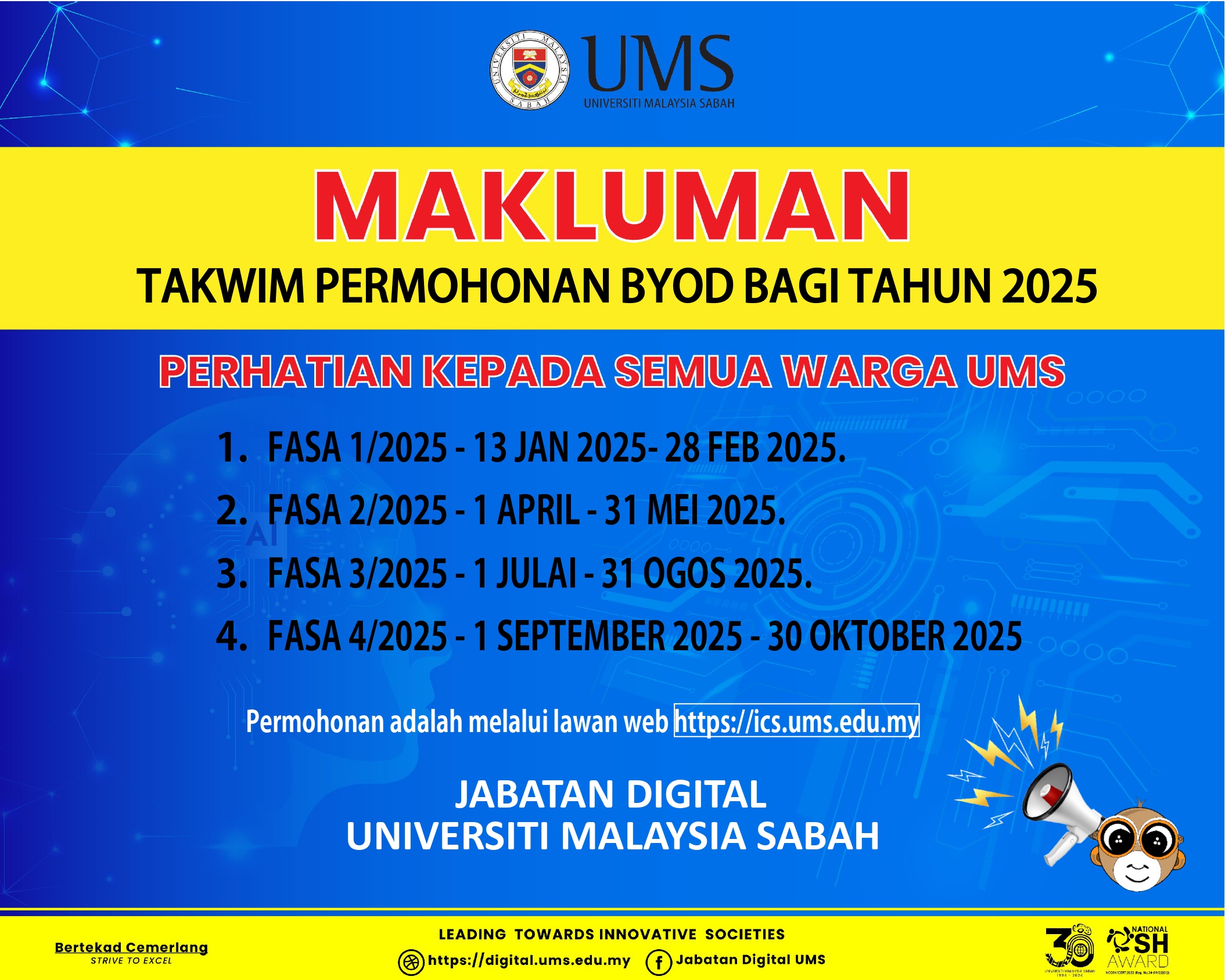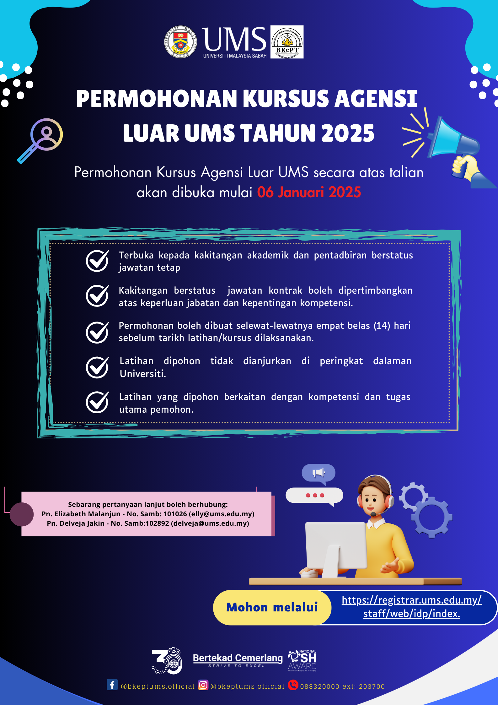 02. Sukacita dimaklumkan Permohonan Kursus Agensi Luar UMS  Tahun 2025 akan dibuka bermula 06 Januari 2025 dan boleh dipohon melalui sistem HR-Online V.4 (MyIDP) di pautan https://registrar.ums.edu.my/staff/web/idp/takwim