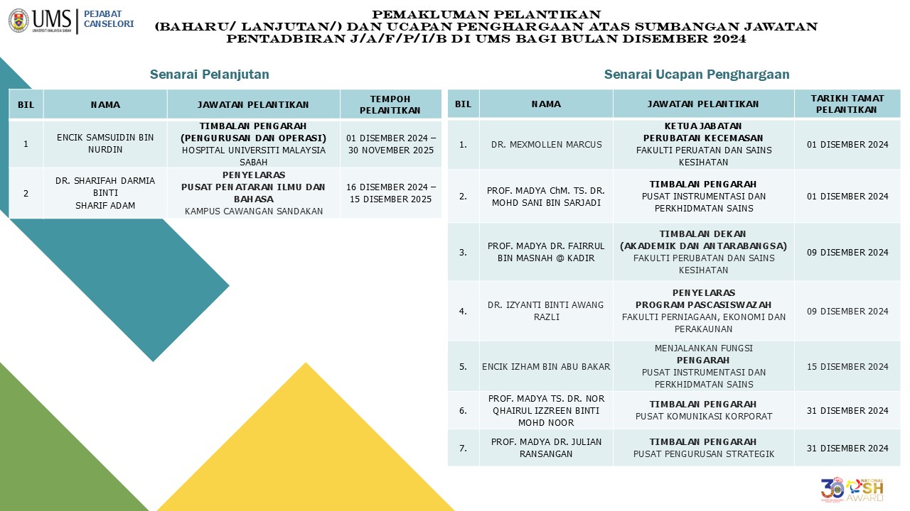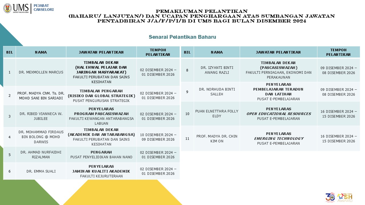 Pemakluman Pelantikan (Baharu/Lanjutan) dan Ucapan Penghargaan Atas Sumbangan Jawatan Pentadbiran J/A/F/P/I/B di UMS
