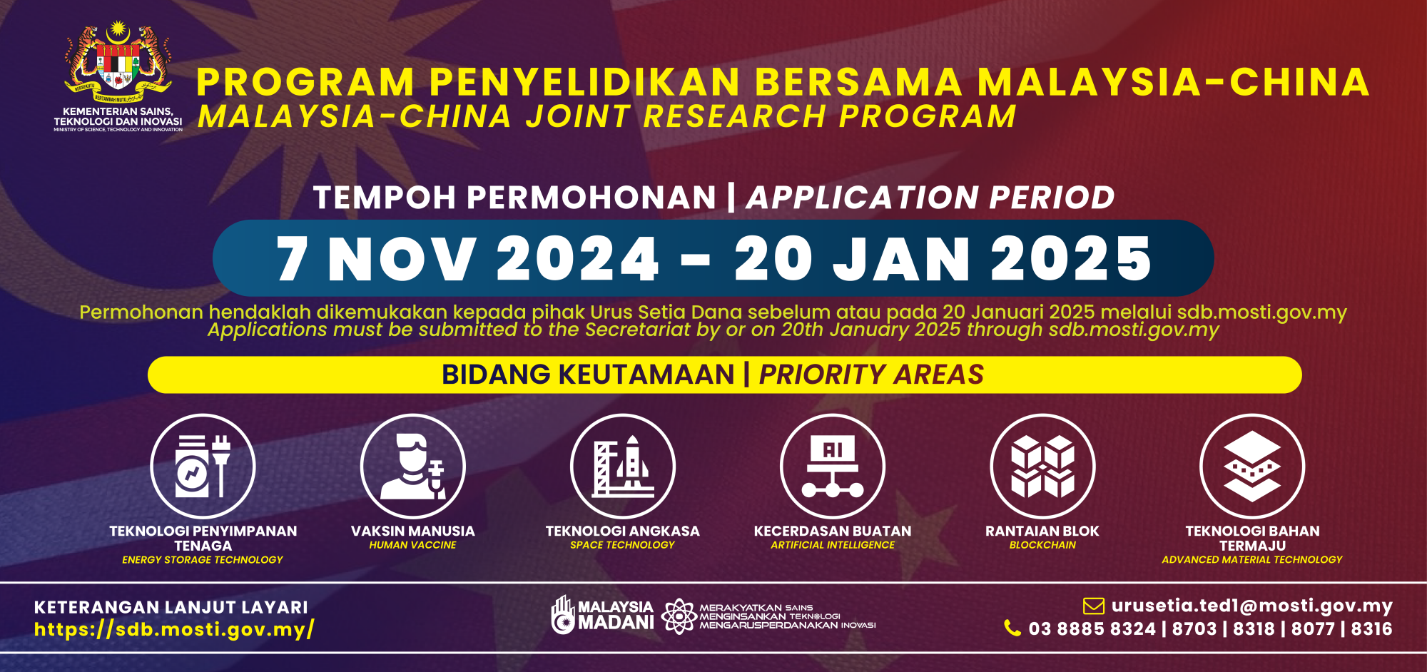 Dimaklumkan bahawa Kementerian Sains, Teknologi dan Inovasi (MOSTI) dan Kementerian Sains dan Teknologi Republik Rakyat China (MOST) telah bersetuju untuk membiayai Program Penyelidikan Bersama Malaysia-China 2025 (SRF-RFP Malaysia-China), dengan tujuan untuk mewujudkan kerjasama yang kukuh melalui sokongan kolaborasi antara pasukan berdasarkan bidang kerjasama yang telah dipersetujui, serta untuk memajukan lagi kerjasama Sains, Teknologi dan Inovasi (STI) yang sedia ada antara kedua-dua negara.