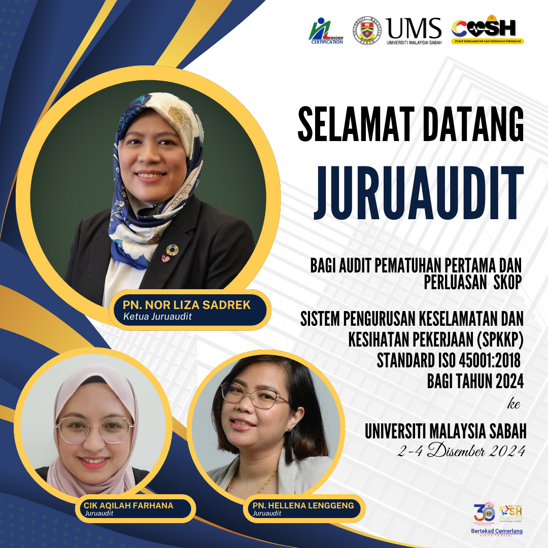 Selamat Datang Juruaudit Bagi Audit Pematuhan Pertama Dan Perluasan Skop Sistem Pengurusan Keselamatan Dan Kesihatan Pekerjaan (SPKKP) Standard ISO 45001:2018 Bagi Tahun 2024 Ke Univerisiti Malaysia Sabah Pada 2-4 Disember 2024