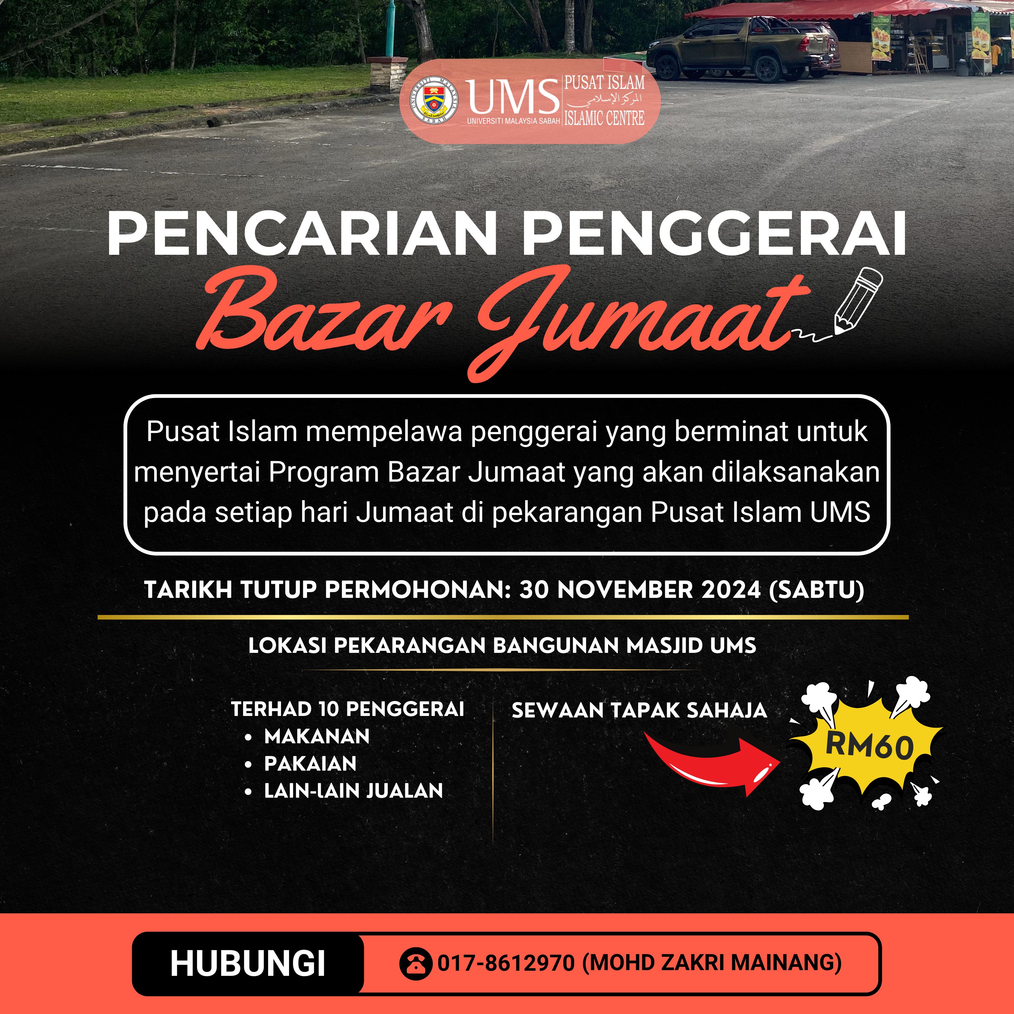 Pusat Islam UMS mempelawa Penggerai yang berminat untuk menyertai Program Bazar Jumaat yang akan dilaksanakan pada setiap hari Jumaat di pekarangan Bangunan Masjid UMS.
