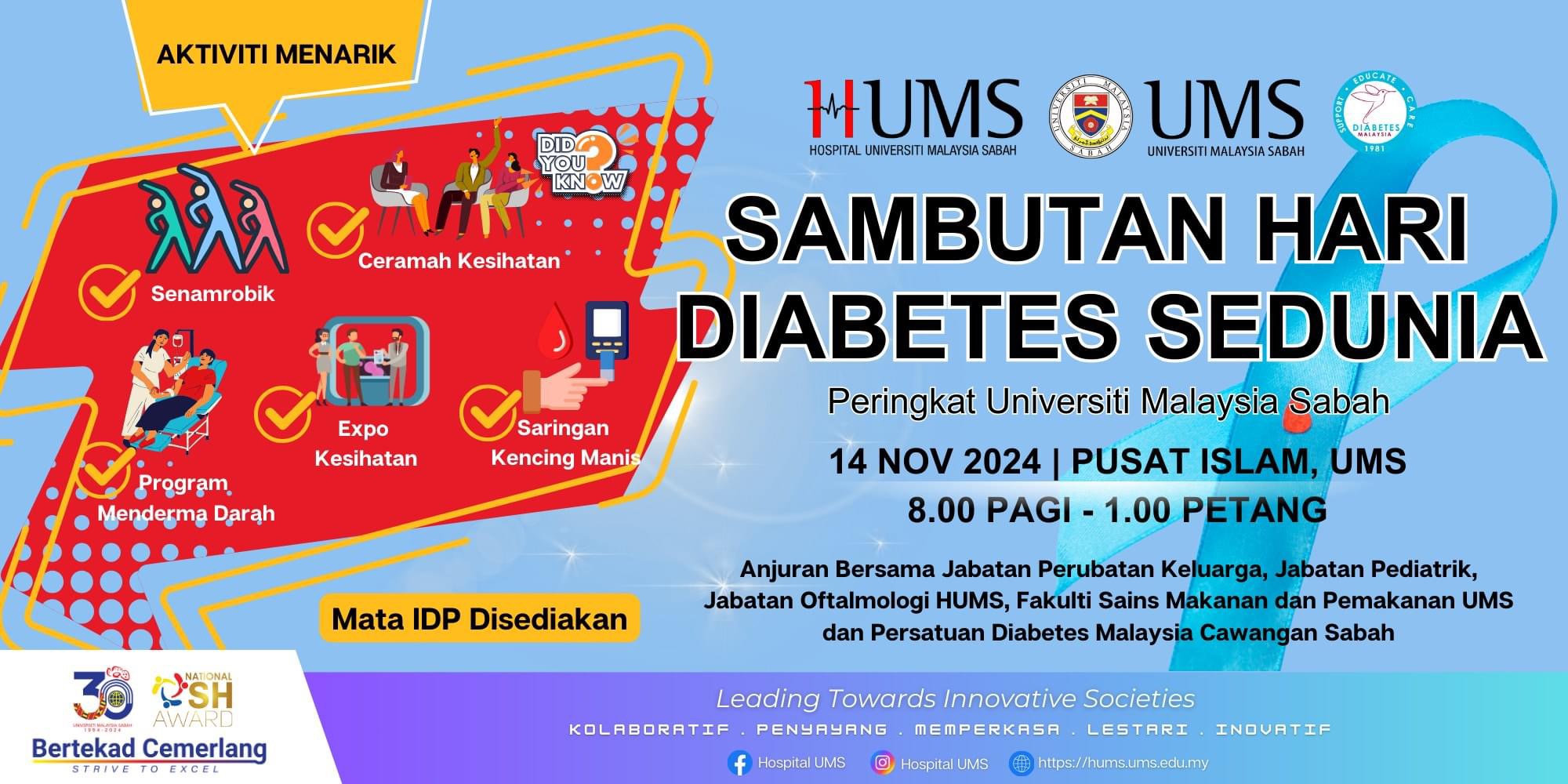 Bersempena dengan Hari Diabetes Sedunia, pihak Hospital Universiti Malaysia Sabah (HUMS) bersama-sama dengan Persatuan Diabetes Malaysia (Sabah) akan mengadakan Program Sambutan Hari Diabetes Sedunia Peringkat UMS yang akan ditetapkan pada butiran berikut: