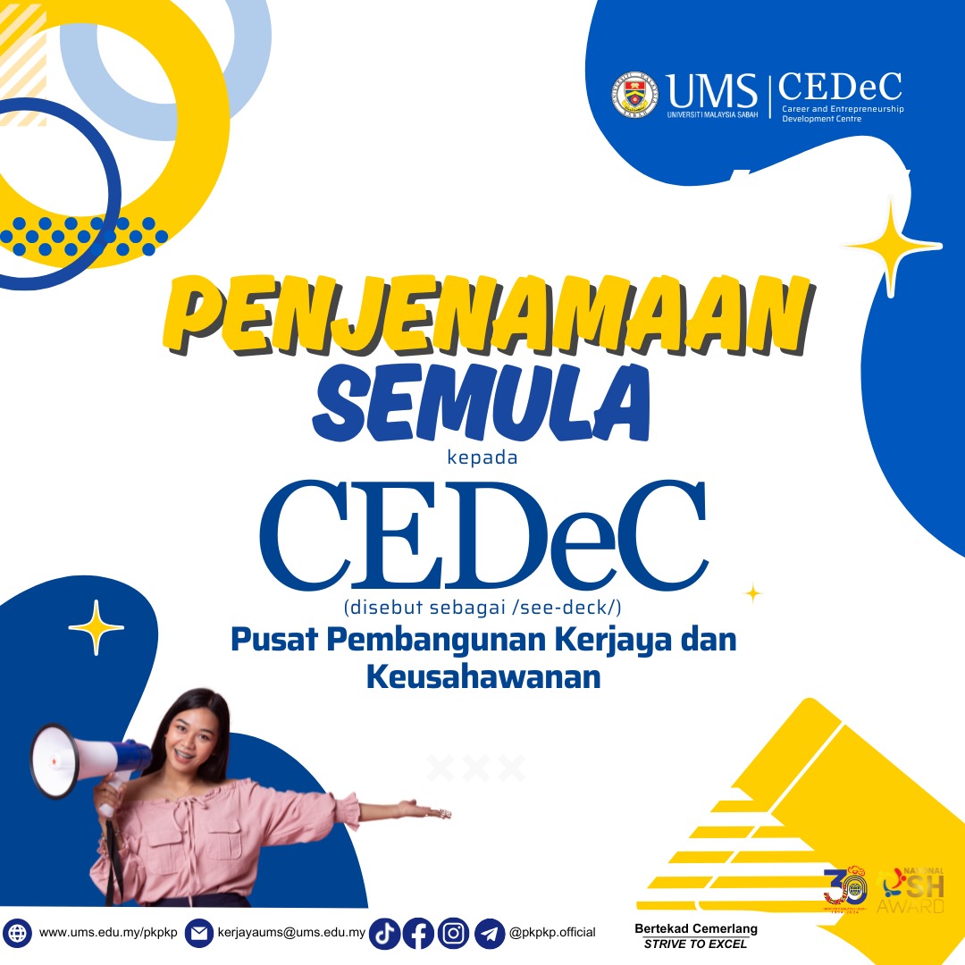2. Dimaklumkan bahawa Mesyuarat Jawatankuasa Pengurusan Universiti (JPU) Bil.18/2024 Kali ke-376 pada 8 Oktober 2024 (Selasa) telah bersetuju meluluskan cadangan penstrukturan dan penjenamaan semula Pusat Kerjaya dan Pembangunan Keusahawanan Pelajar (PKPKP) ke Pusat Pembangunan Kerjaya dan Keusahawanan (CEDeC). Sehubungan itu, sebarang urusan dengan PKPKP hendaklah menggunakan nama baharu seperti yang dinyatakan di atas.