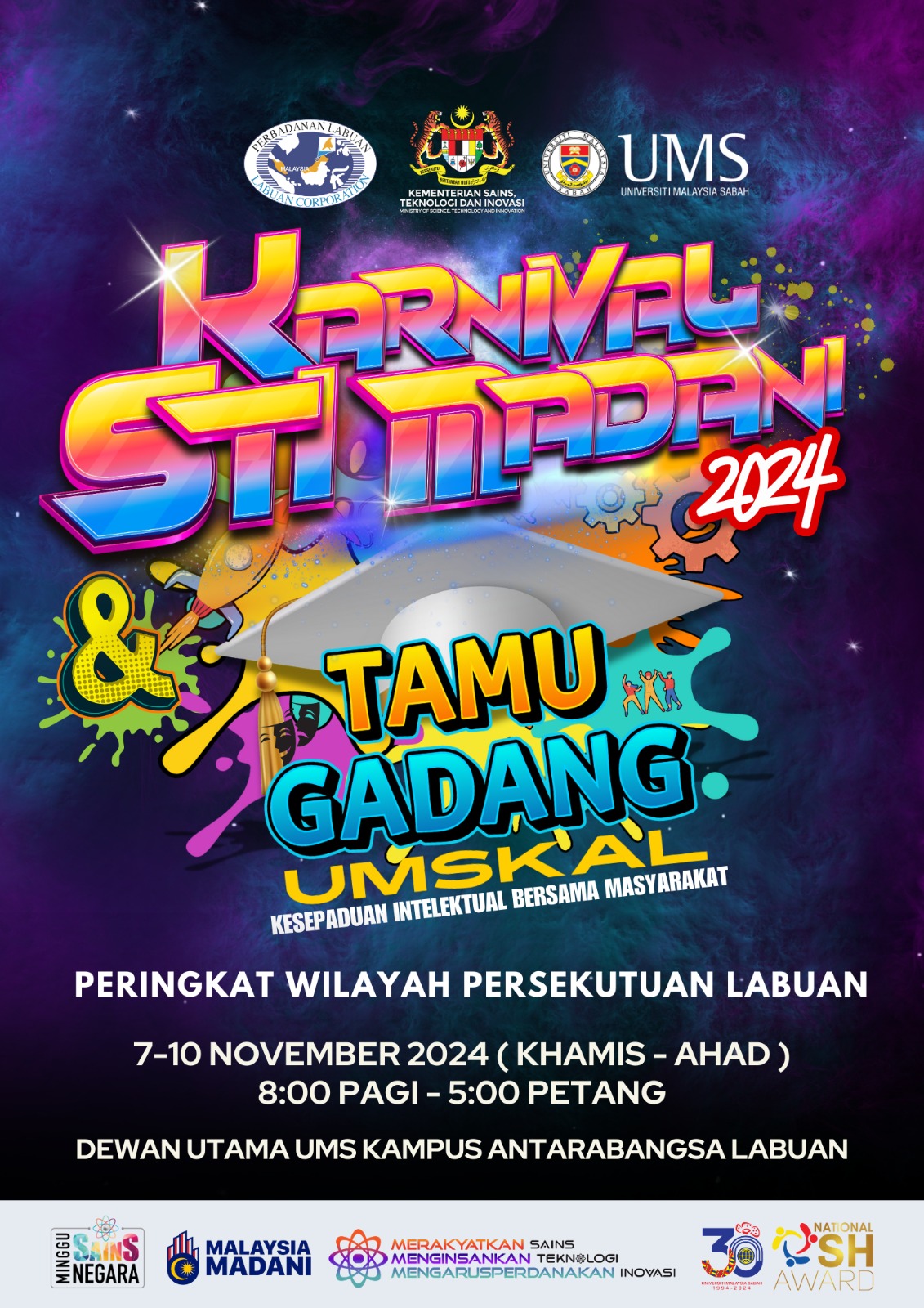 Sukacita dimaklumkan bahawa Kementerian Sains, Teknologi dan Inovasi Malaysia (MOSTI) dengan kerjasama Perbadanan Labuan dan Universiti Malaysia Sabah (UMS) akan mengadakan Karnival STI Madani 2024 dan Tamu Gadang UMSKAL Peringkat Wilayah Persekutuan Labuan.