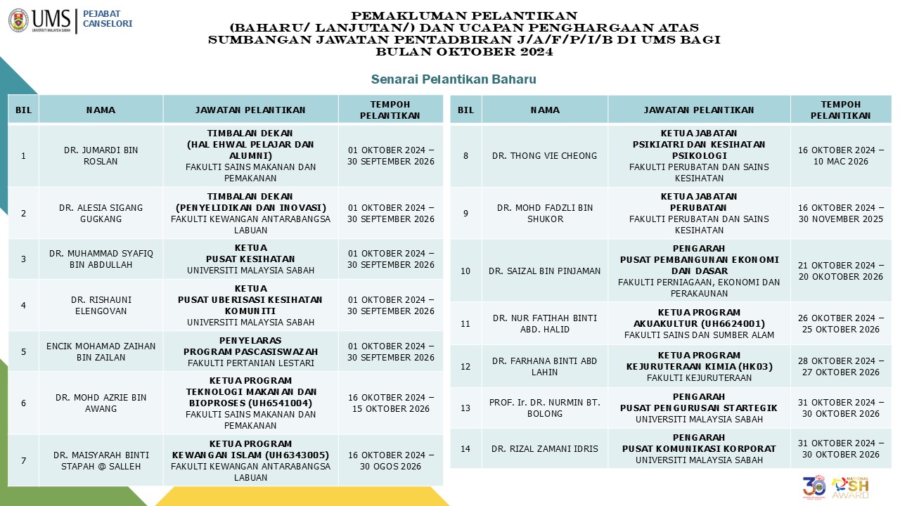 Pemakluman Pelantikan (Baharu/ Lanjutan/) dan Ucapan Penghargaan Atas Sumbangan Jawatan Pentadbiran J/A/F/P/I/B di UMS
