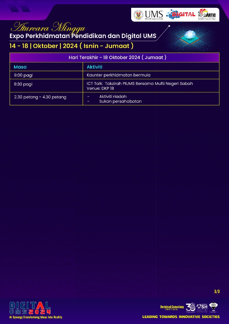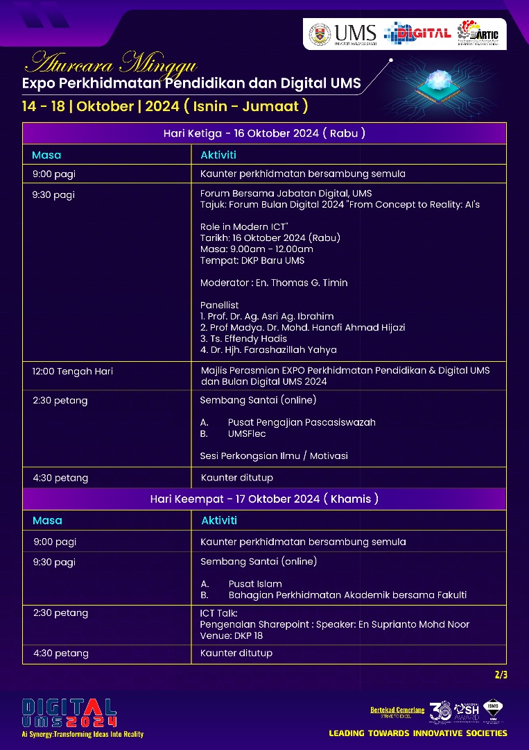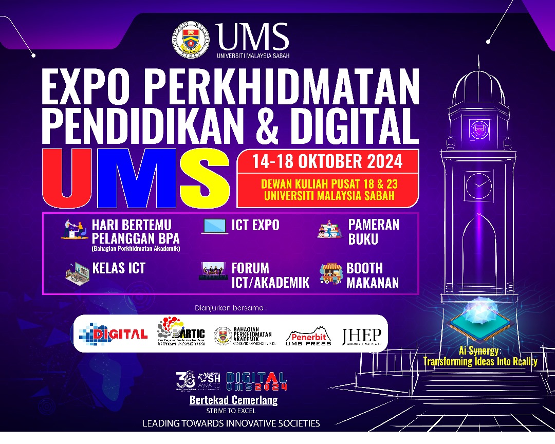 Jangan lepaskan peluang untuk menyertai program yang menarik sepanjang Expo Perkhidmatan Pendidikan & Digital UMS 14-18 Oktober 2024! Semua dengan sukacitanya diundang untuk menyertai program ini kerana banyak acara menarik termasuklah: