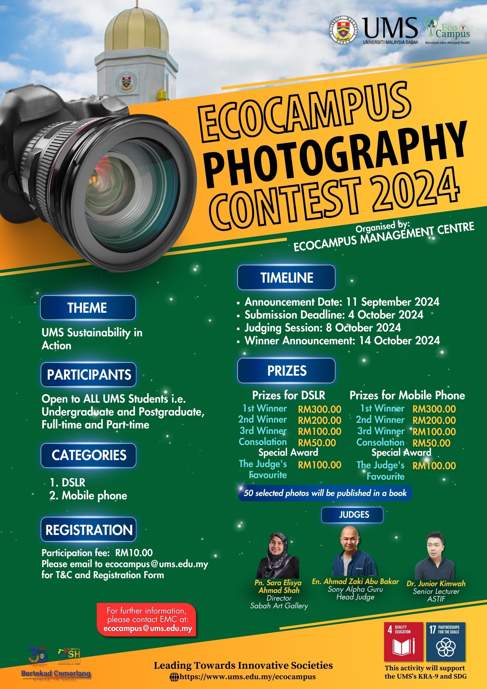 Jom....Tunjukkan bakat anda dalam "Photography"....Hadiah lumayan disediakan oleh Pusat Pengurusan EcoCampus selaku penganjur rasmi pertandingan🌿. Penyertaan bermula dari 11 Sept hingga 04 Okt 2024 dan terhad kepada Pelajar UMS sahaja (Pra dan Pasca)🌿Jangan lepaskan peluang hebat ini untuk meraih kemenangan dengan kenangan gambar-gambar terbaik tahun 2024 ini.