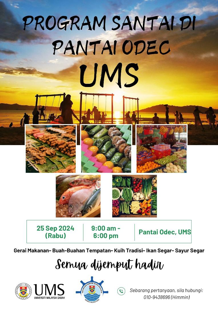 Pusat Penyelidikan Ekonomi Biru dan Keselamatan Maritim UMS menjemput semua warga UMS ke program Santai di Pantai ODEC UMS yang akan diadakan seperti berikut: