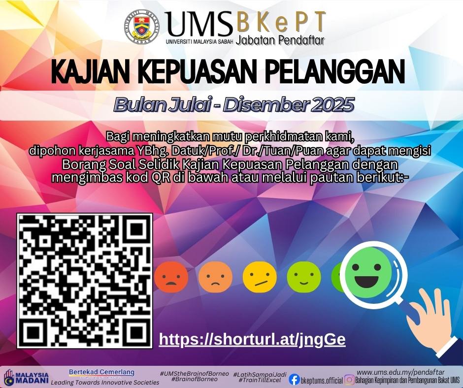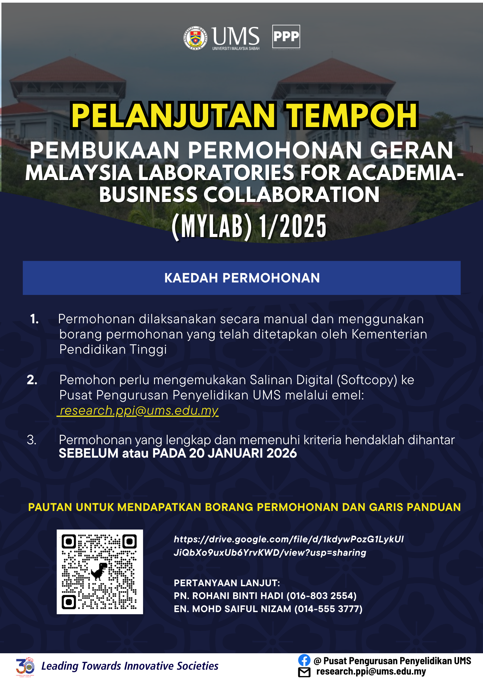 Dimaklumkan bahawa hasil Mesyuarat Board of Governors (BOG) MyLAB Bil. 2 Tahun 2025 bertarikh 19 Disember 2025 telah memutuskan agar tempoh pembukaan permohonan geran MyLAB 1/2025 dilanjutkan sehingga 20 Januari 2026 bagi memastikan penilaian dalaman di peringkat universiti dapat dilaksanakan dengan teliti sebelum dikemukakan kepada JPT, KPT untuk proses penilaian seterusnya.
