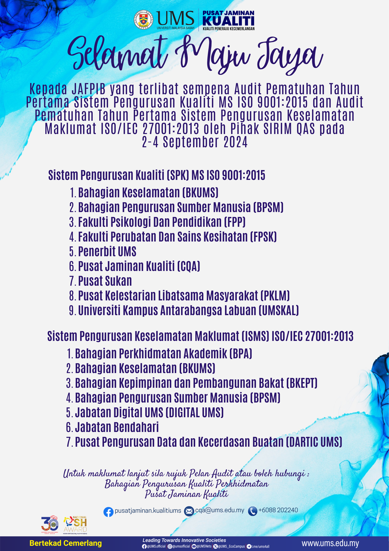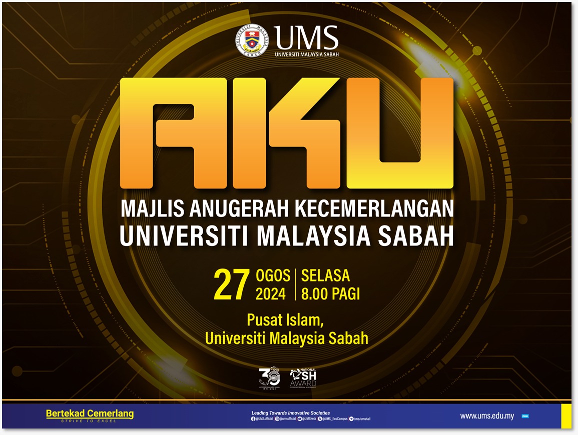 Sukacita dimaklumkan penganjuran Majlis Anugerah Kecemerlangan Universiti Malaysia Sabah (AKU) Tahun 2024 akan berlangsung pada ketetapan seperti berikut: