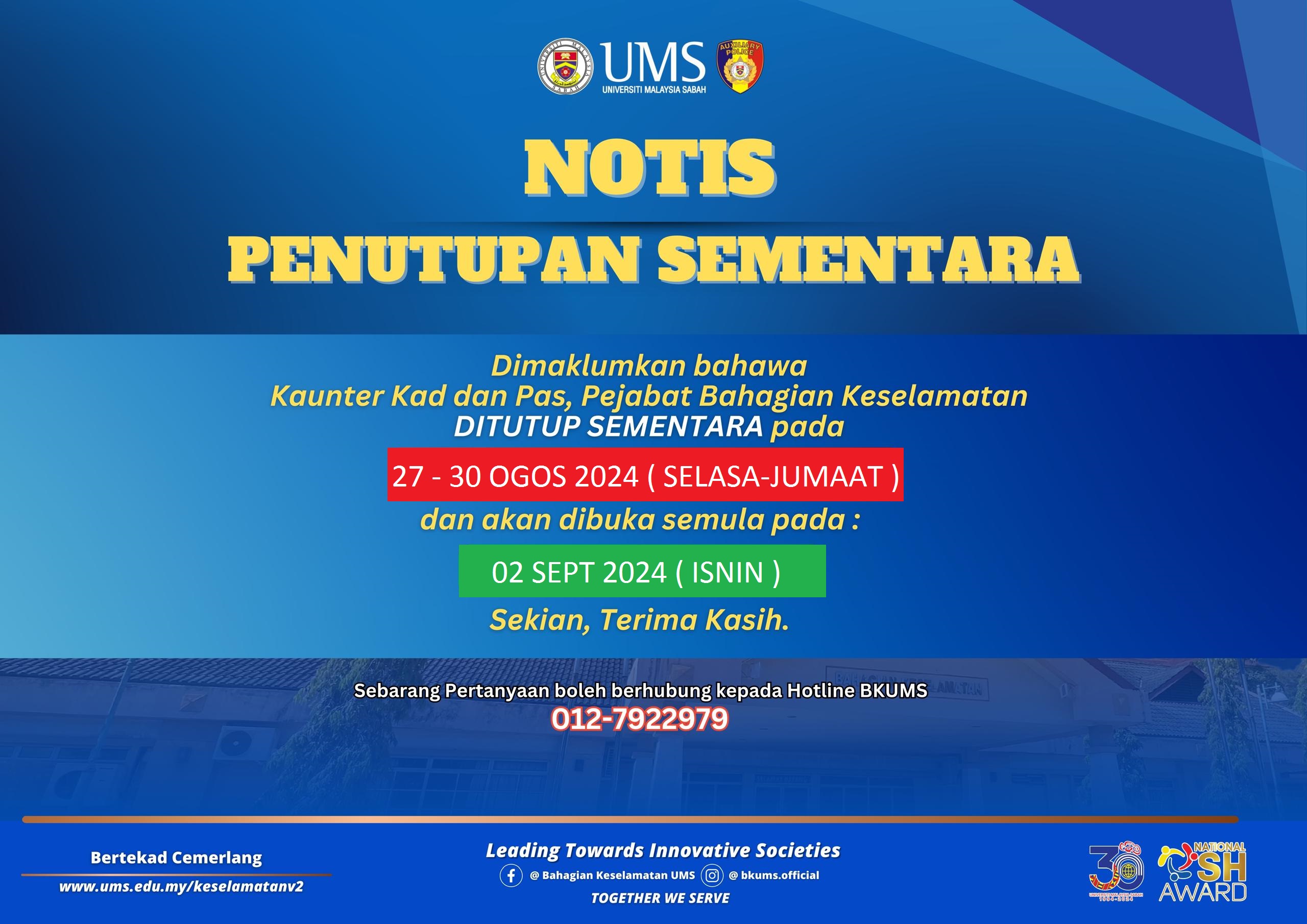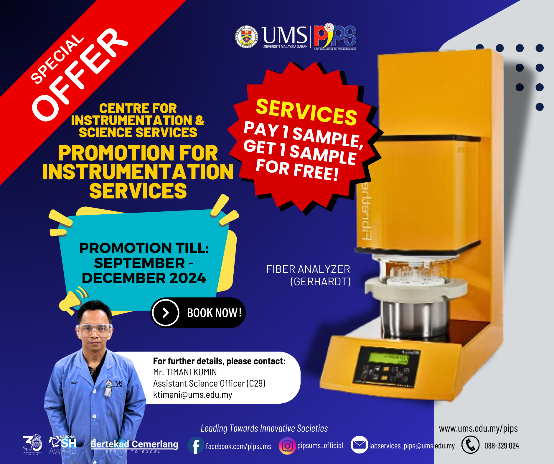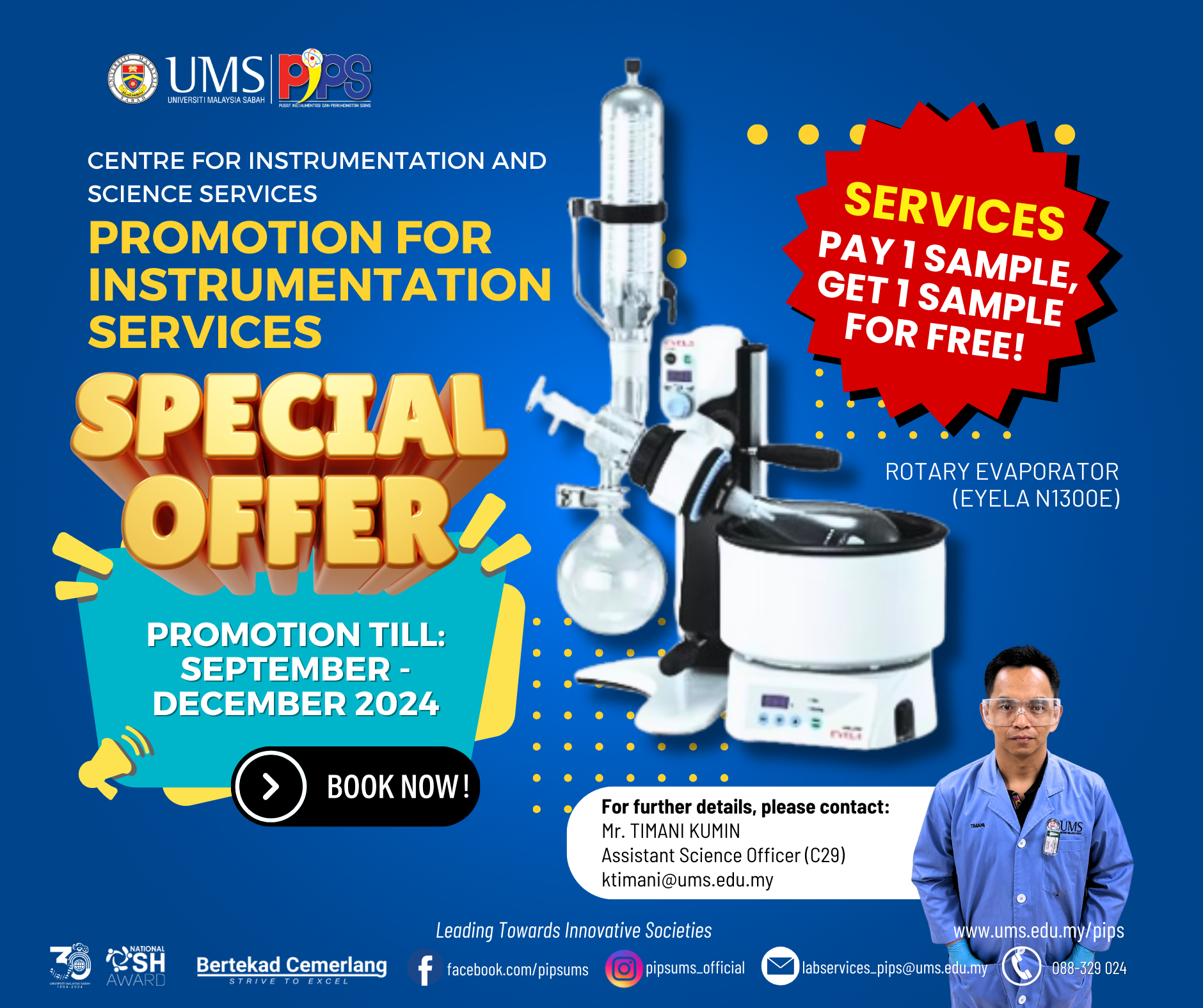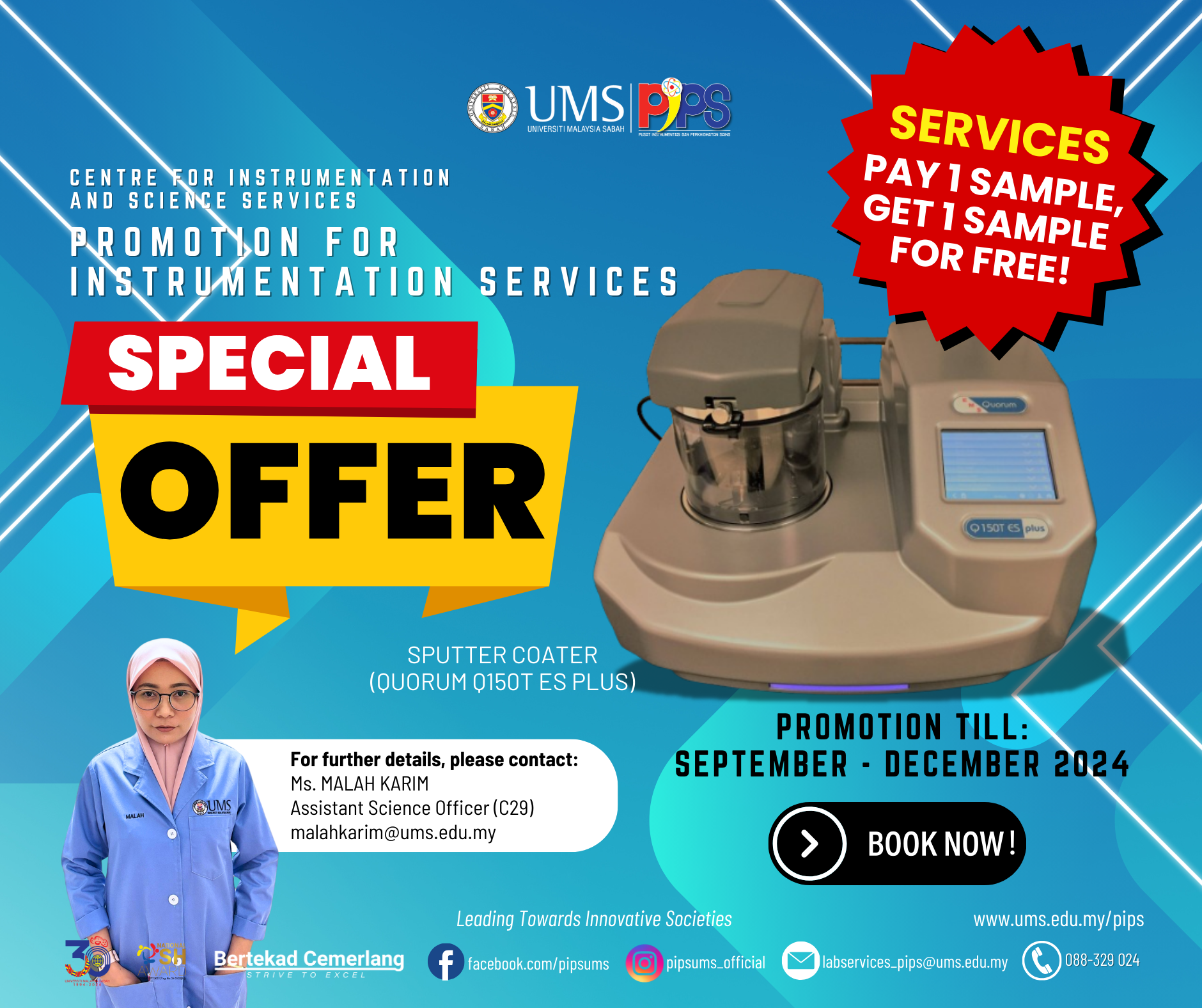 Sukacita dimaklumkan, bersama ini dilampirkan poster hebahan berkaitan promosi perkhidmatan instrumen yang disediakan di Pusat Instrumentasi dan Perkhidmatan Sains (PIPS) Universiti Malaysia Sabah untuk rujukan dan makluman YBhg. Prof/Prof. Madya Dr./Dr./Tuan/Puan.