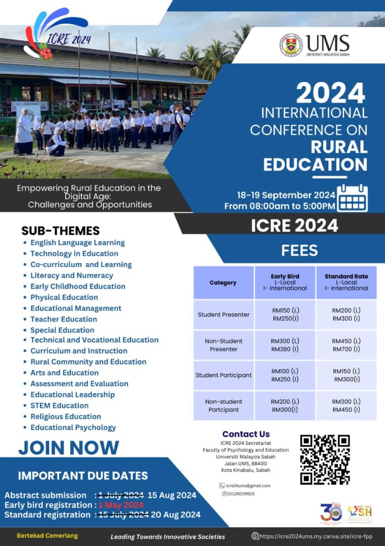 2. Sukacita dimaklumkan bahawa pihak Fakulti Psikologi dan Pendidikan, Universiti Malaysia Sabah akan menganjurkan persidangan International Conference on Rural Education (ICRE) 2024 pada 18 September 2024 sehingga 19 September 2024 bertempat di Fakulti Psikologi dan Pendidikan, Universiti Malaysia Sabah.