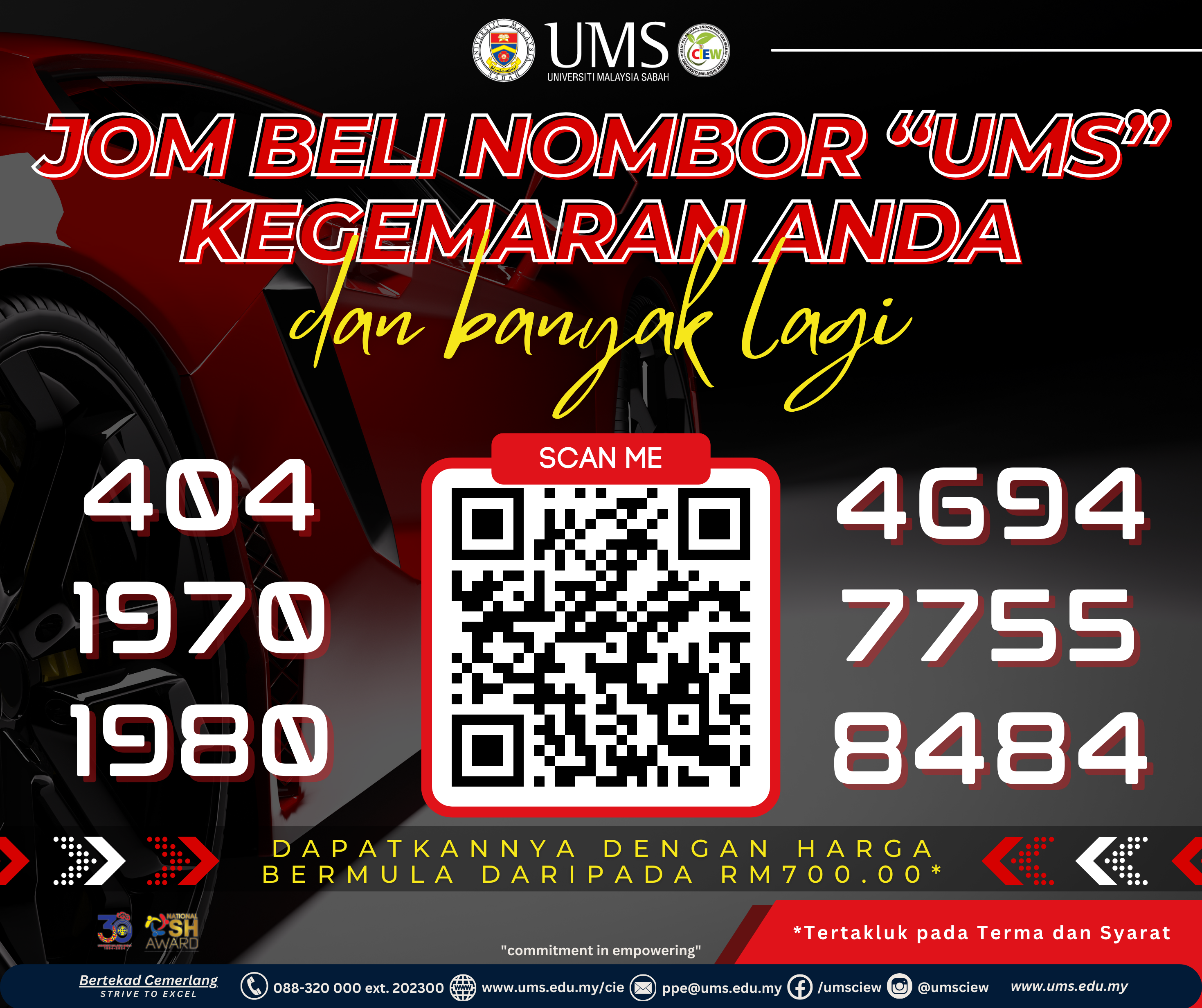 Pusat Pelaburan, Endowmen dan Wakaf (CIEW) menawarkan diskaun hebat lagi memikat khususnya kepada kakitangan UMS yang membuat pembelian nombor pendaftaran kenderaan "UMS".