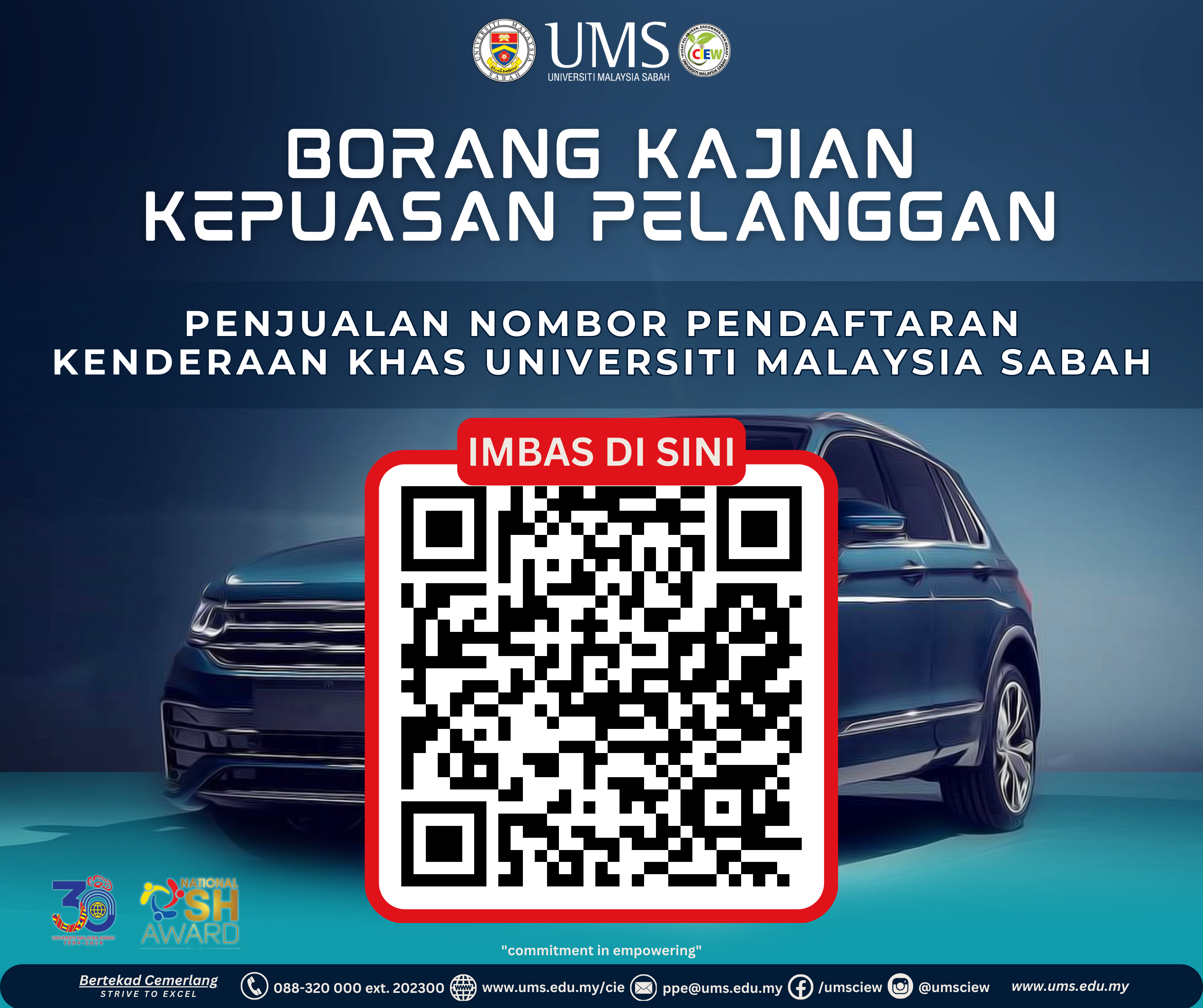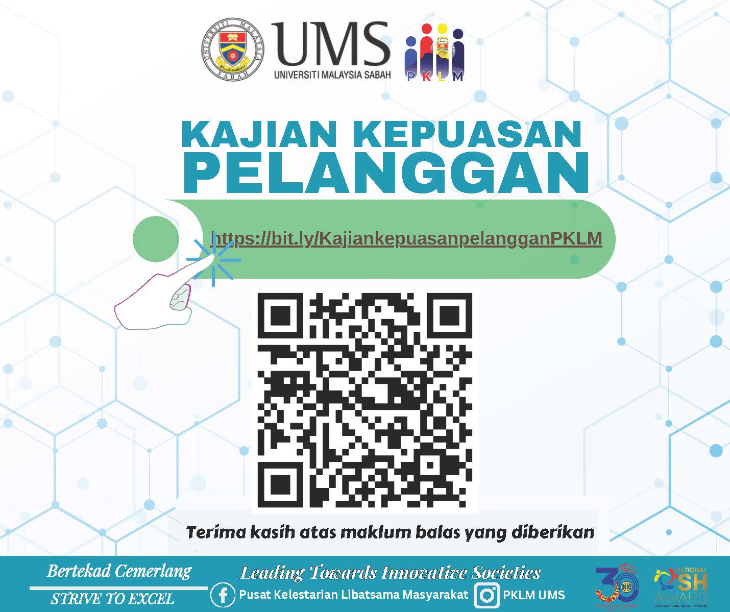 Pihak PKLM amat mengalu-alukan komen dan cadangan semua warga UMS dan komuniti mengenai penyampaian perkhidmatan PKLM dengan mengisi KKP yang disediakan di pautan https://bit.ly/KajiankepuasanpelangganPKLM atau imbas kod QR yang disediakan.