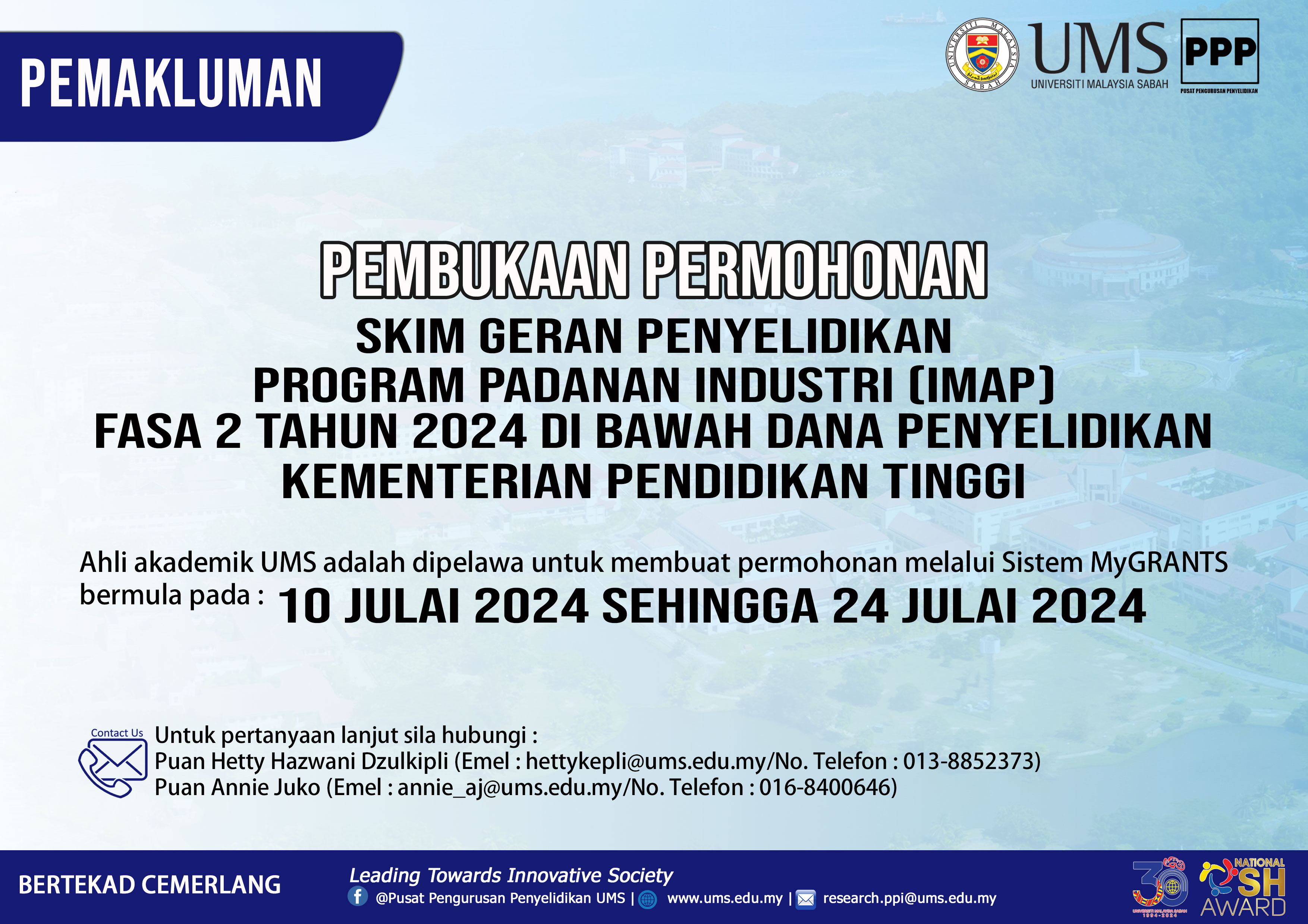 Pemakluman Pembukaan Skim Geran Penyelidikan Program Padanan Industri (IMaP) Fasa 2 Tahun 2024 Di Bawah Dana Penyelidikan Kementerian Pendidikan Tinggi