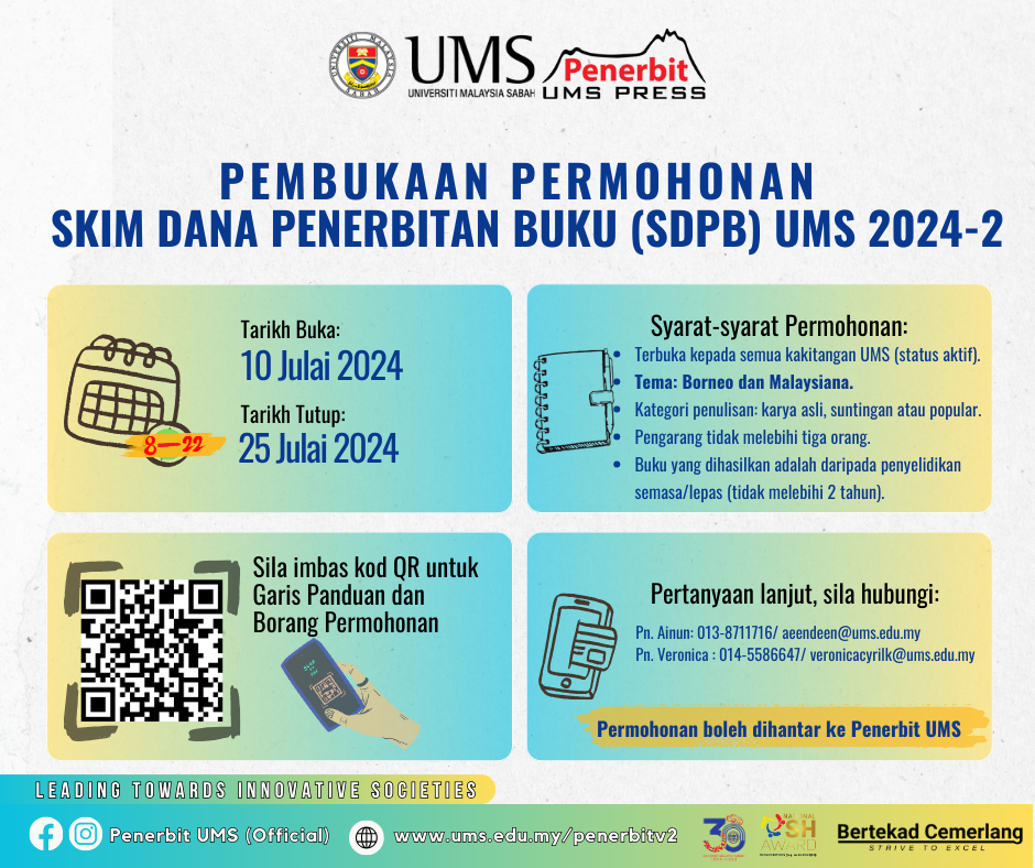 Garis Panduan, Borang Permohonan dan dokumen berkaitan boleh dicapai melalui pautan https://tinyurl.com/danabukuartikel24. Permohonan boleh dihantar ke Penerbit UMS, Isnin-Jumaat, 9.00 pagi - 4.00 petang.