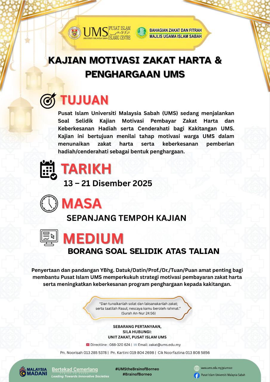 Pusat Islam Universiti Malaysia Sabah (UMS) sedang menjalankan Soal Selidik Kajian Motivasi Zakat Harta & Penghargaan UMS. Kajian ini bertujuan menilai tahap motivasi warga UMS dalam menunaikan zakat harta serta keberkesanan pemberian hadiah/cenderahati sebagai bentuk penghargaan.