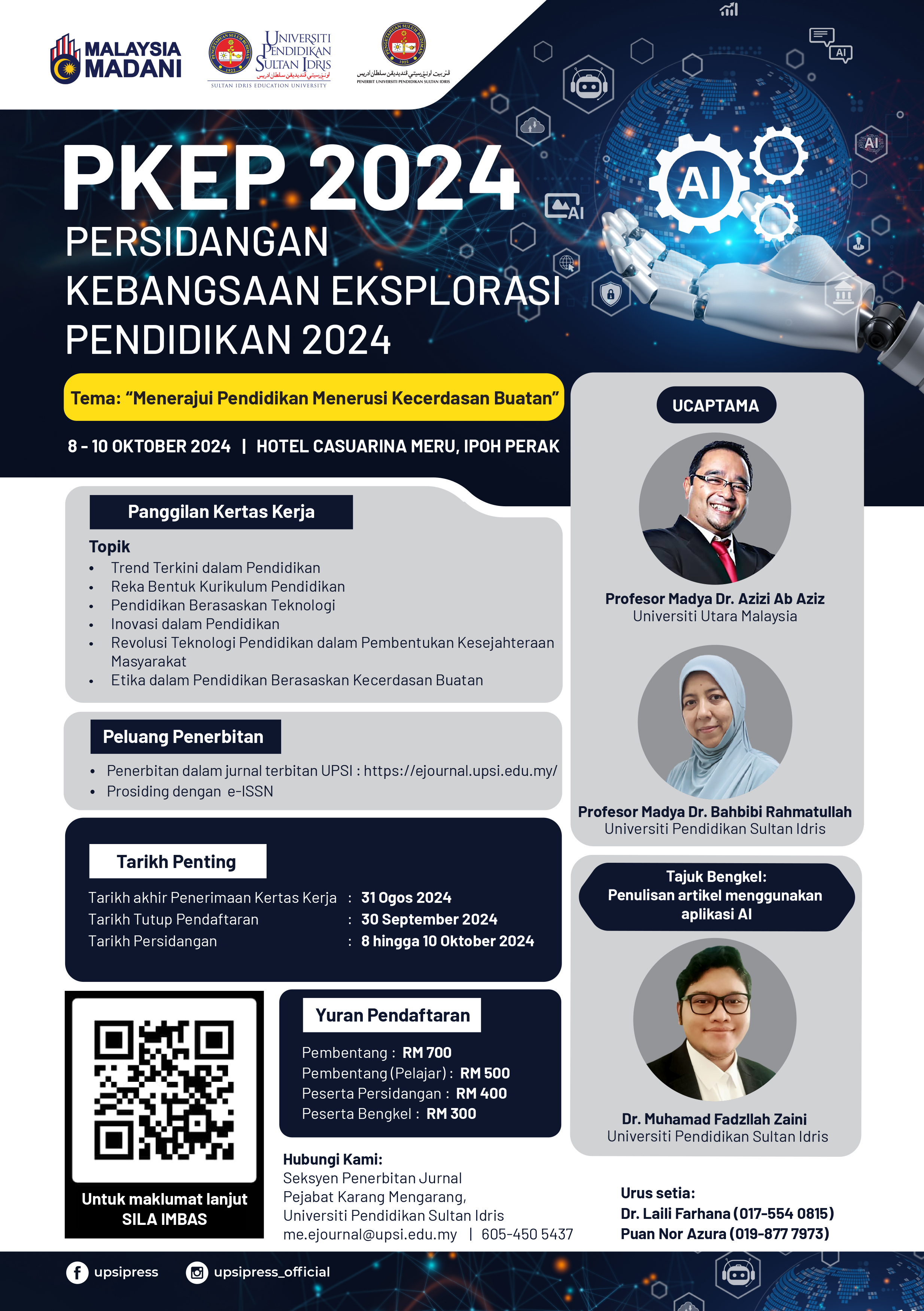 4.        Sehubungan itu, Sekretariat PKEP 2024 amat berbesar hati mengalu-alukan penyertaan ahli akademik, ahli profesional, penyelidik, pendidik dan pelajar untuk menghantar wakil ke persidangan ini. Kertas kerja persidangan berpeluang diterbitkan dalam jurnal terbitan UPSI yang diindeks oleh Scopus/ESCI/DOAJ/Mycite dan prosiding dengan e-ISSN. Sila layari laman sesawang https://pkep.upsi.edu.my/ untuk akses maklumat-maklumat terkini PKEP 2024. Sebarang pertanyaan, boleh berhubung dengan pihak urus setia persidangan Dr. Laili Farhana binti Md Ibharim (017-554 0815) atau Puan Nor Azura binti Mustafa Bakri (019-877 7973). Sila imbas kod QR pada poster untuk maklumat lanjut.
