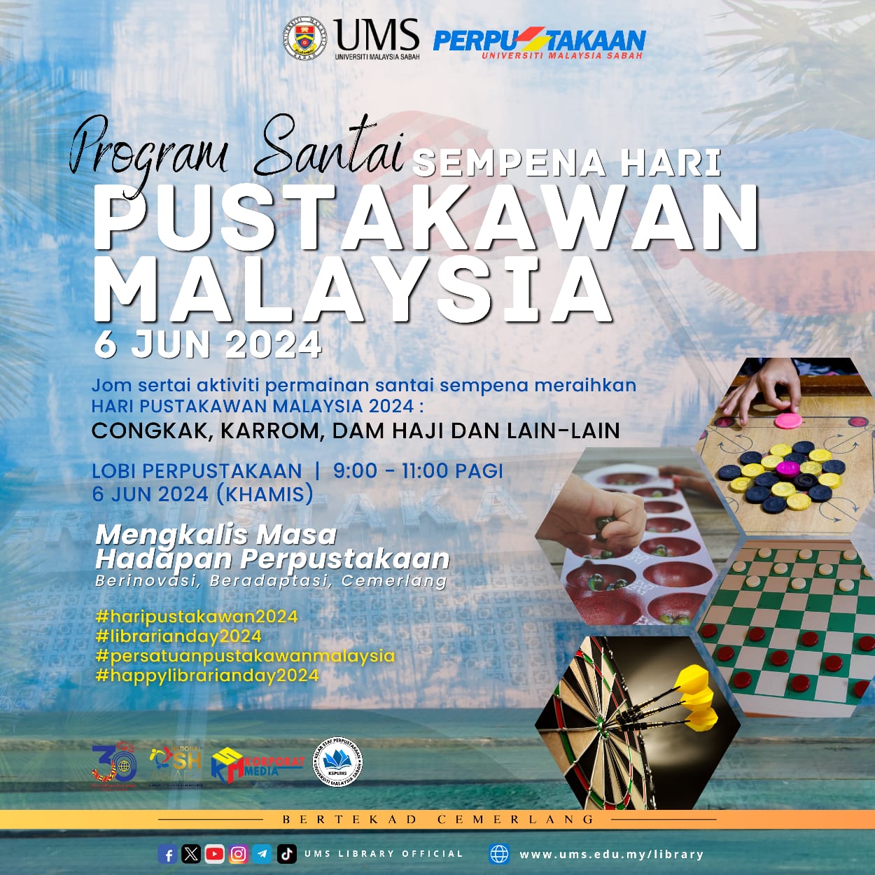 Bersempena Hari Pustakawan Malaysia 2024, Perpustakaan Universiti Malaysia Sabah dengan kerjasama KSPUMS akan mengadakan aktiviti Program Santai Sempena Hari Pustakawan Malaysia.
