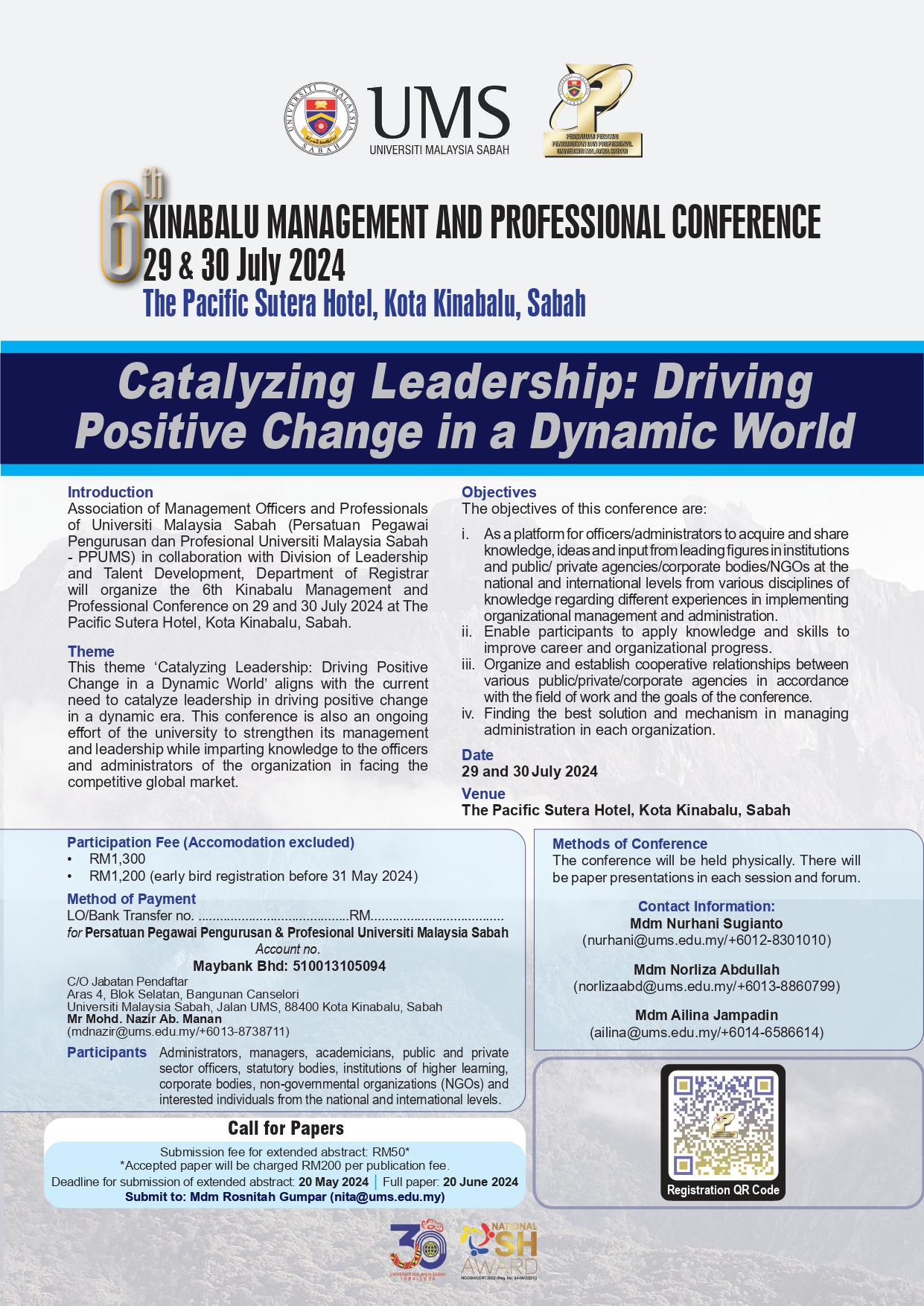 Oleh itu, PPUMS ingin menjemput YBhg. Datuk/Dato’/Datin/Prof./Dr./Tuan/Puan untuk menyertai Persidangan Pengurusan dan Profesional Kinabalu VI Tahun 2024.