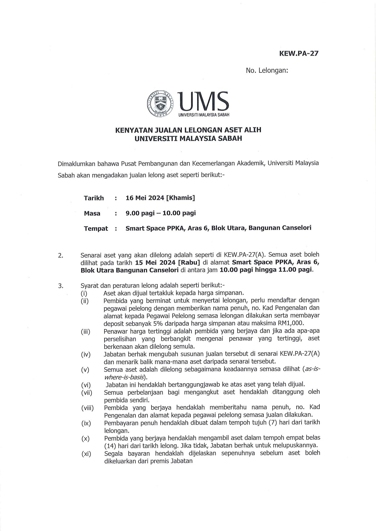 | Iklan Jualan Lelong Aset Alih Pusat Pembangunan Dan Kecemerlangan Akademik |