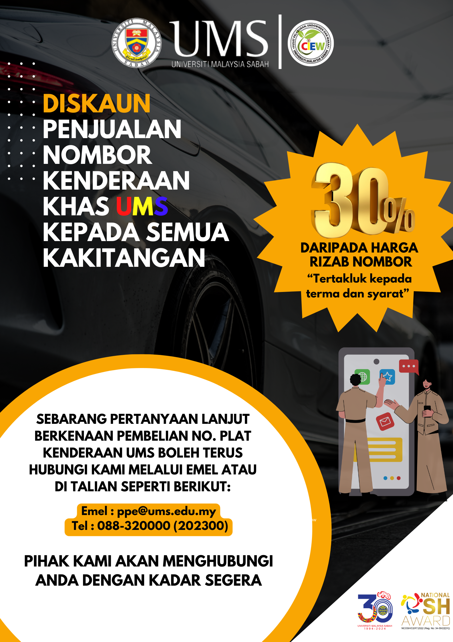 Diskaun penjualan nombor kenderaan khas UMS kepada semua kakitangan UMS sahaja. Sebarang pertanyaan lanjut berkenaan pembelian Nombor Plat Kenderaan UMS boleh terus hubungi kami melalui emel atau di talian seperti berikut: