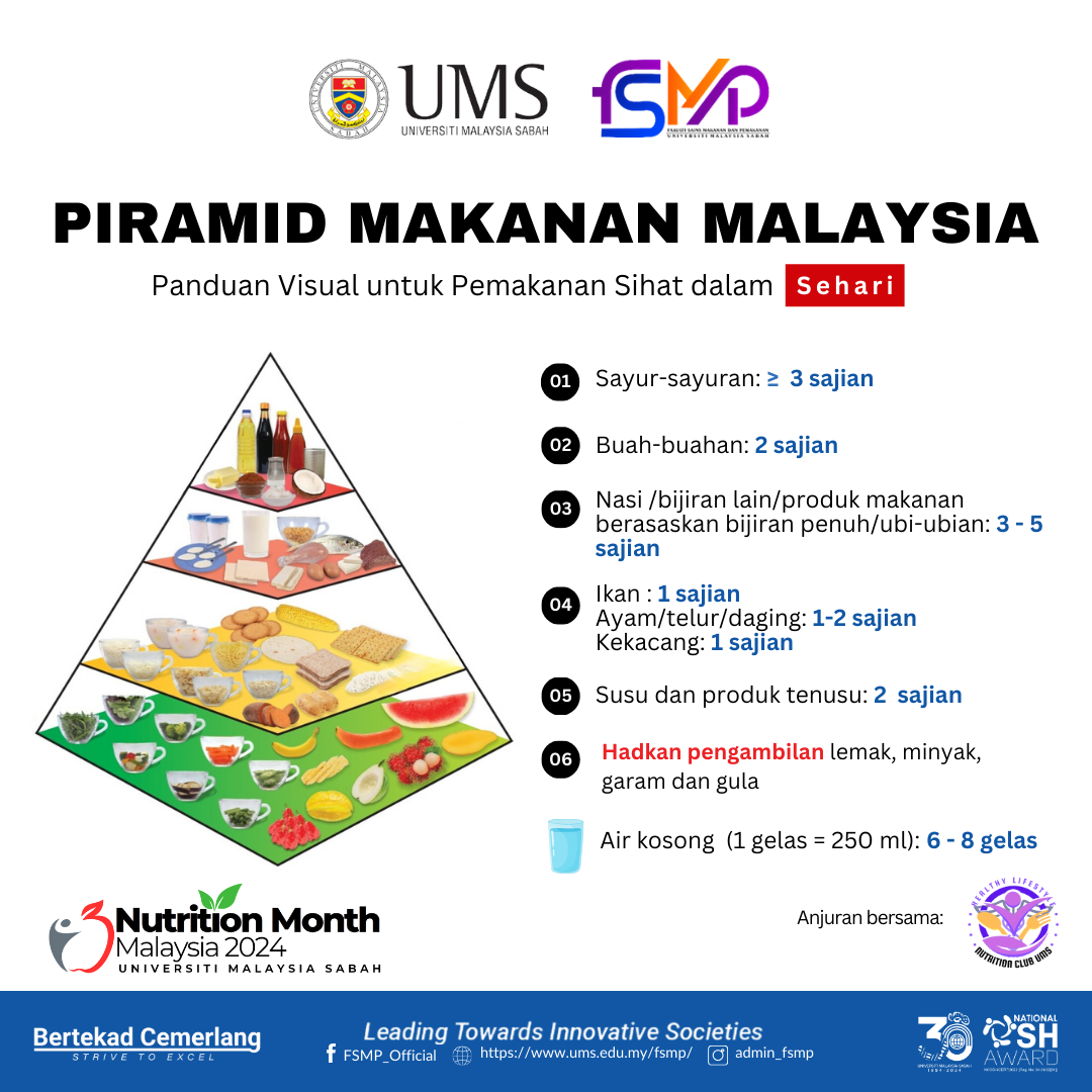 Dengan menggunakan Piramid Makanan Malaysia, kita boleh merancang pengambilan makanan harian. Ambil kumpulan makanan yang berada di bahagian bawah lebih banyak berbanding di bahagian atas.